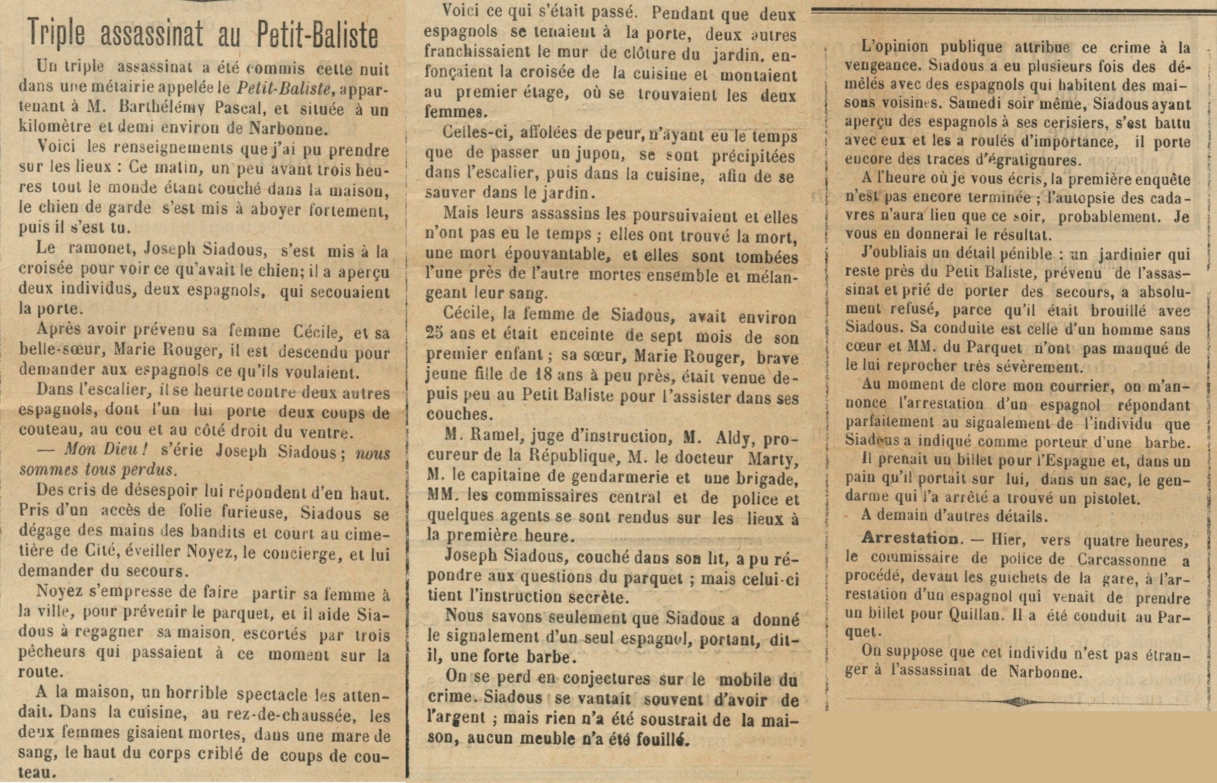 Un triple assassinat a été commis cette nuit dans une métairie appelée le Petit-Baliste, appartenant à M. Barthélémy Pascal, et située à un kilomètre et demi environ de Narbonne.