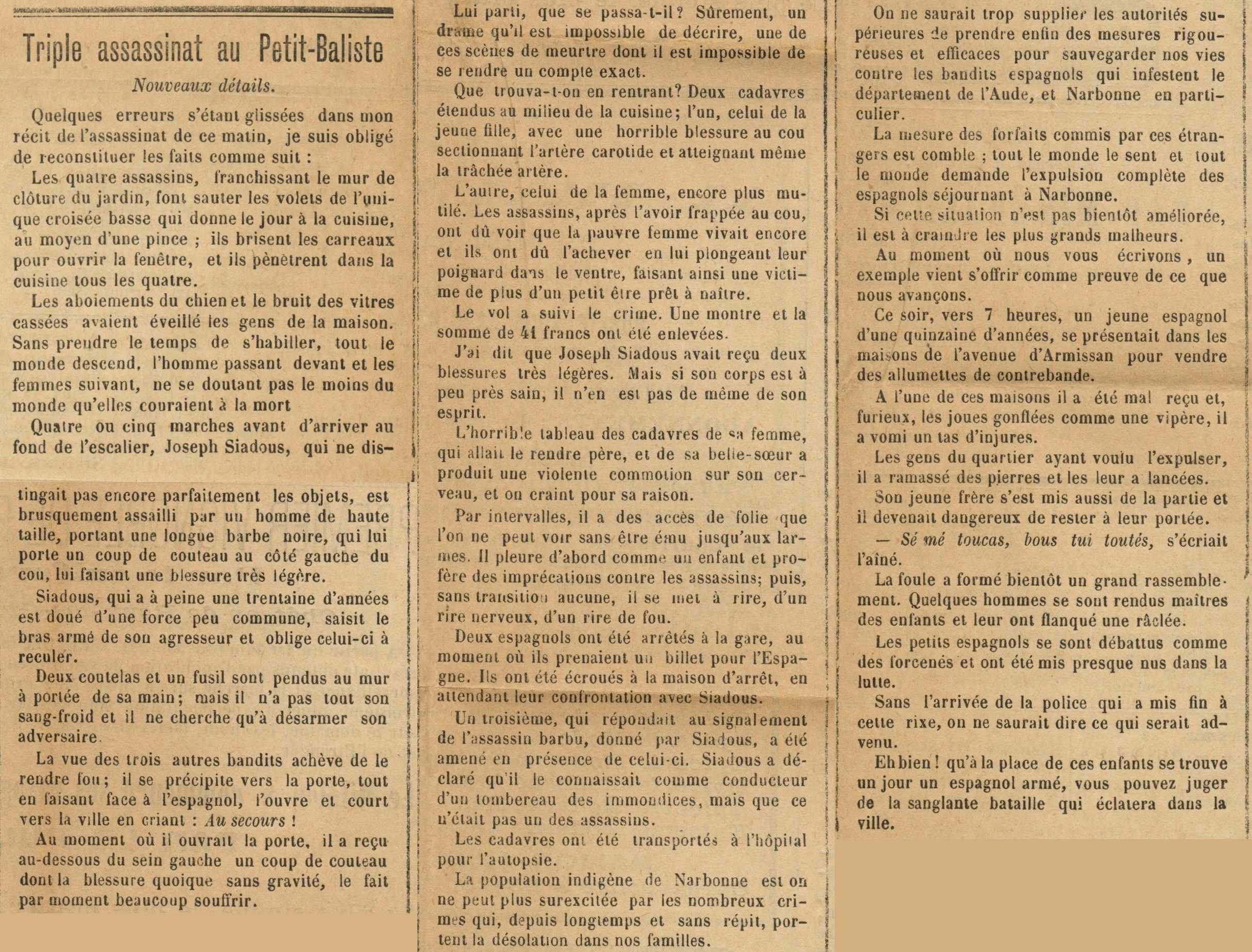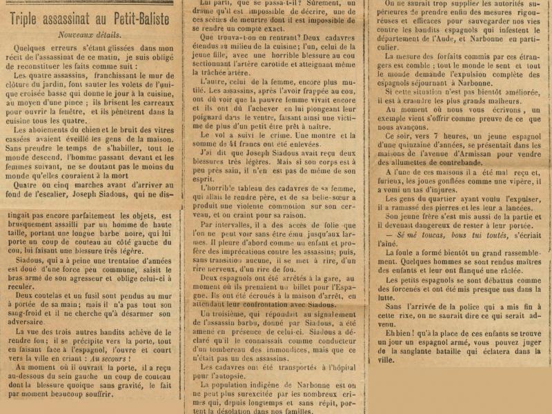 Triple assassinat au Petit-Baliste, nouveaux détails dans Le Courrier de l’Aude du 15 juin 1887