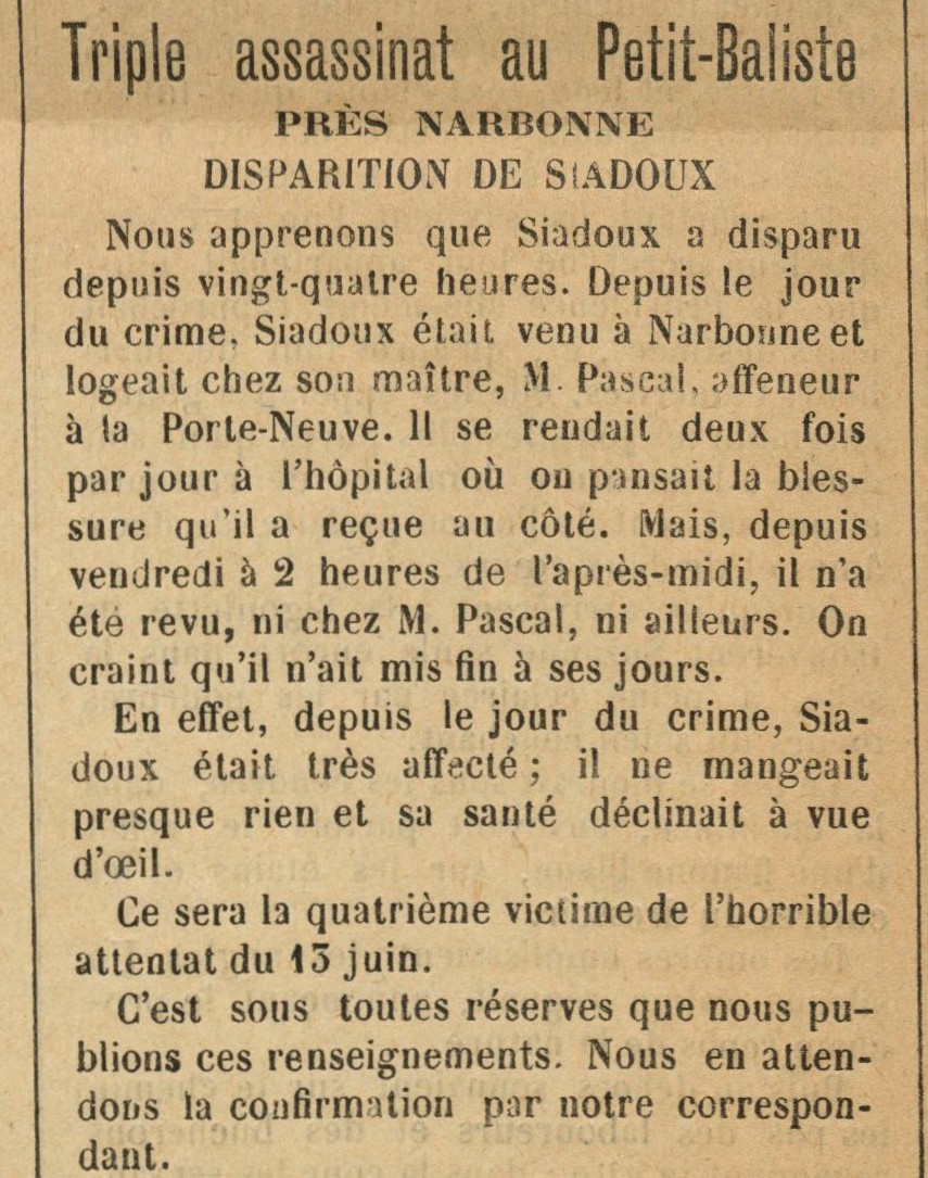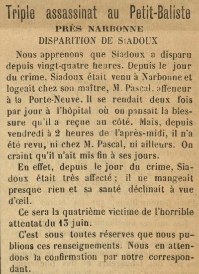 Nous apprenons que Siadoux a disparu depuis vingt-quatre heures. Depuis le jour du crime, Siadoux était venu à Narbonne et logeait chez son maître, M. Pascal, affineur à la Porte-Neuve. Il se rendait deux fois par jour à l'hôpital où on pansait la blessure qu'il a reçue au côté. Mais depuis vendredi à 2 heures de l'après-midi, il n'a été revu ni chez M. Pascal ni ailleurs. On craint qu'il n'ait mis fin à ses jours. En effet, depuis le jour du crime, Siadoux était très affecté ; il ne mangeait presque rien et sa santé déclinait à vue d'oeil. Ce sera la quatrième victime de l'horrible attentat du 13 juin. C'est sous toutes réserves que nous publions ces renseignements. Nous en attendons la confirmation par notre correspondant.