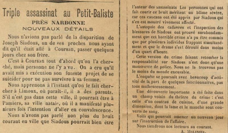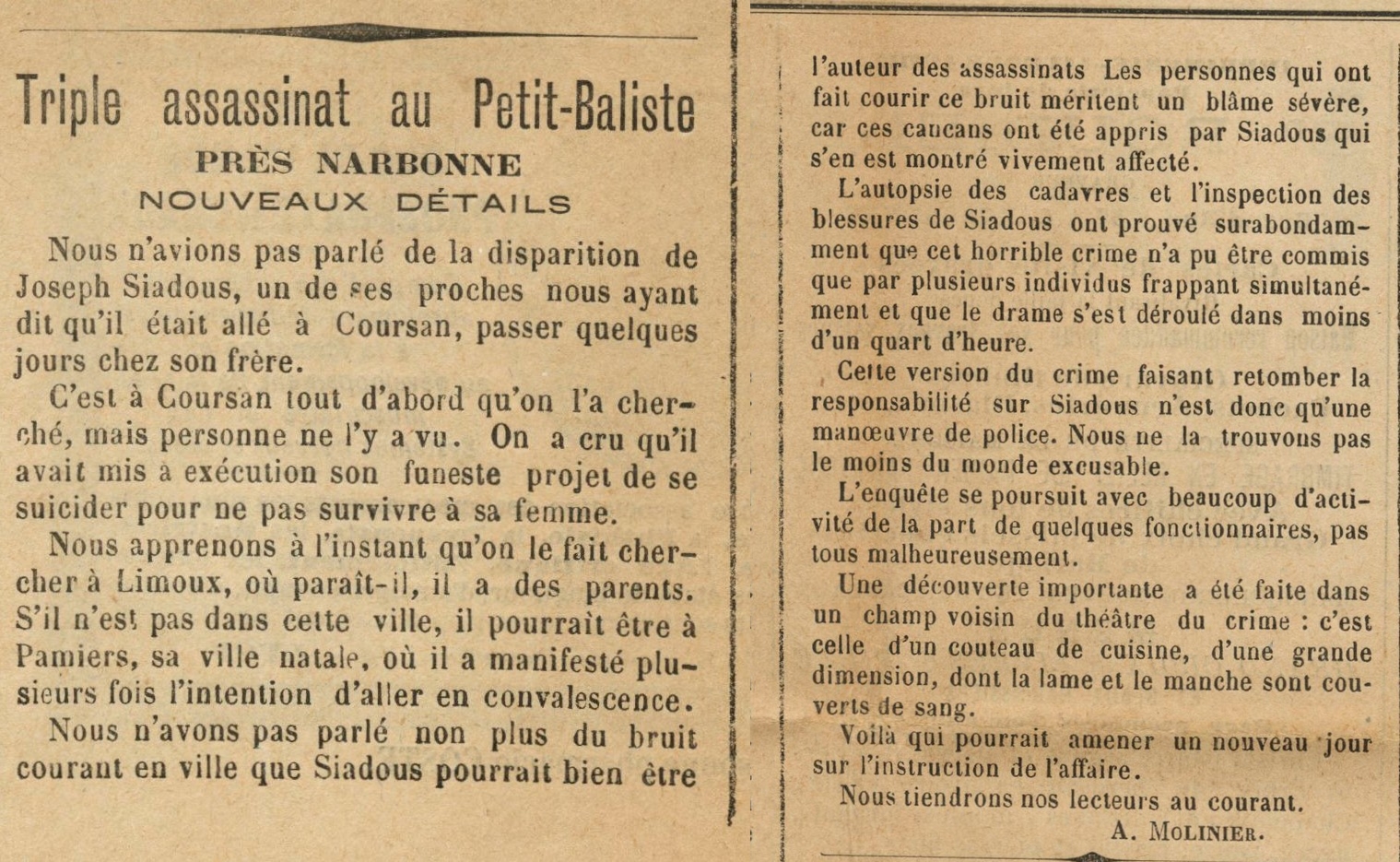 Triple assassinat au Petit-Baliste près Narbonne : nouveaux détails, Courrier de l’Aude du 21 juin 1887