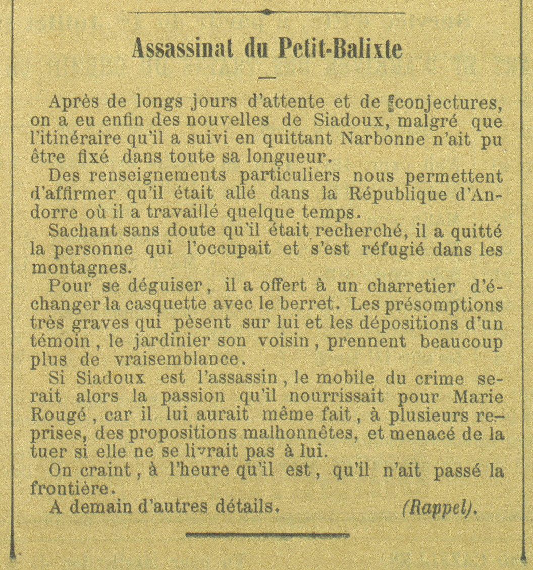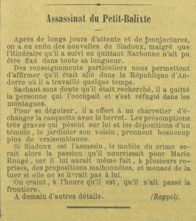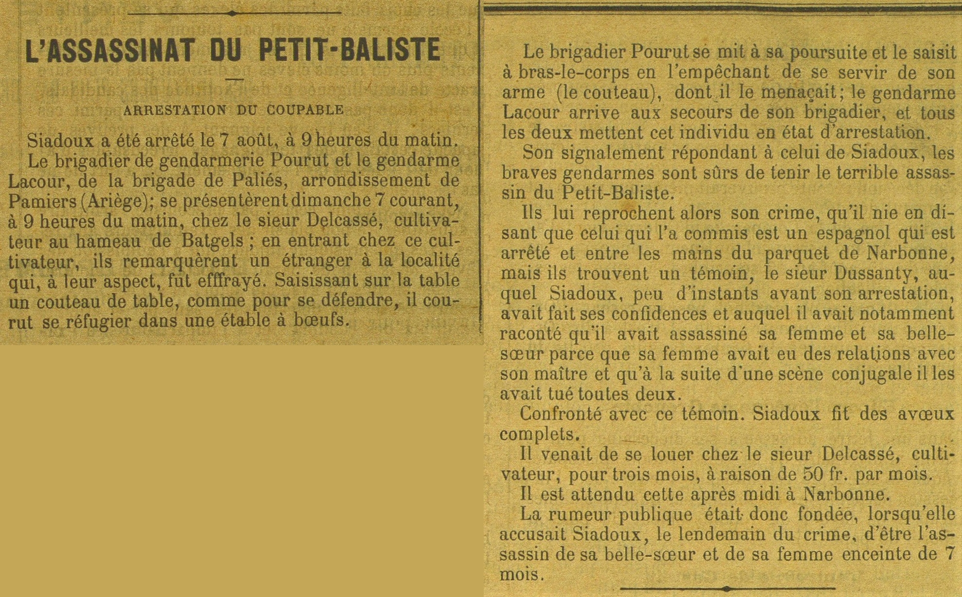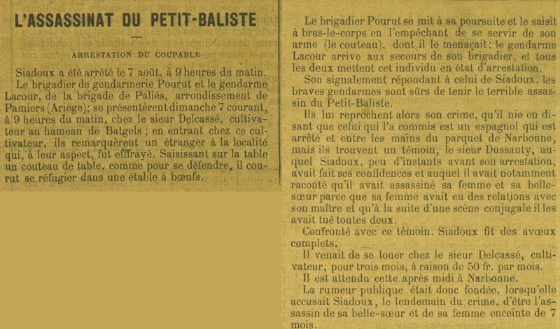 Siadoux a été arrêté le 7 août, à 9 heures du matin. Le brigadier de gendarmerie Pourut et le gendarme Lacour, de la brigade de Paliés, arrondissement de Pamiers (Ariège) ; se présentèrent dimanche 7 courant, à 9 heures du matin, chez le sieur Delcassé, cultivateur au hameau de Batgels ; en entrant chez ce cultivateur, ils remarquèrent un étranger à la localité qui, à leur aspect, fut effrayé. Saisissant sur la table un couteau de table, comme pour se défendre, il courut se réfugier dans une étable à bœufs.