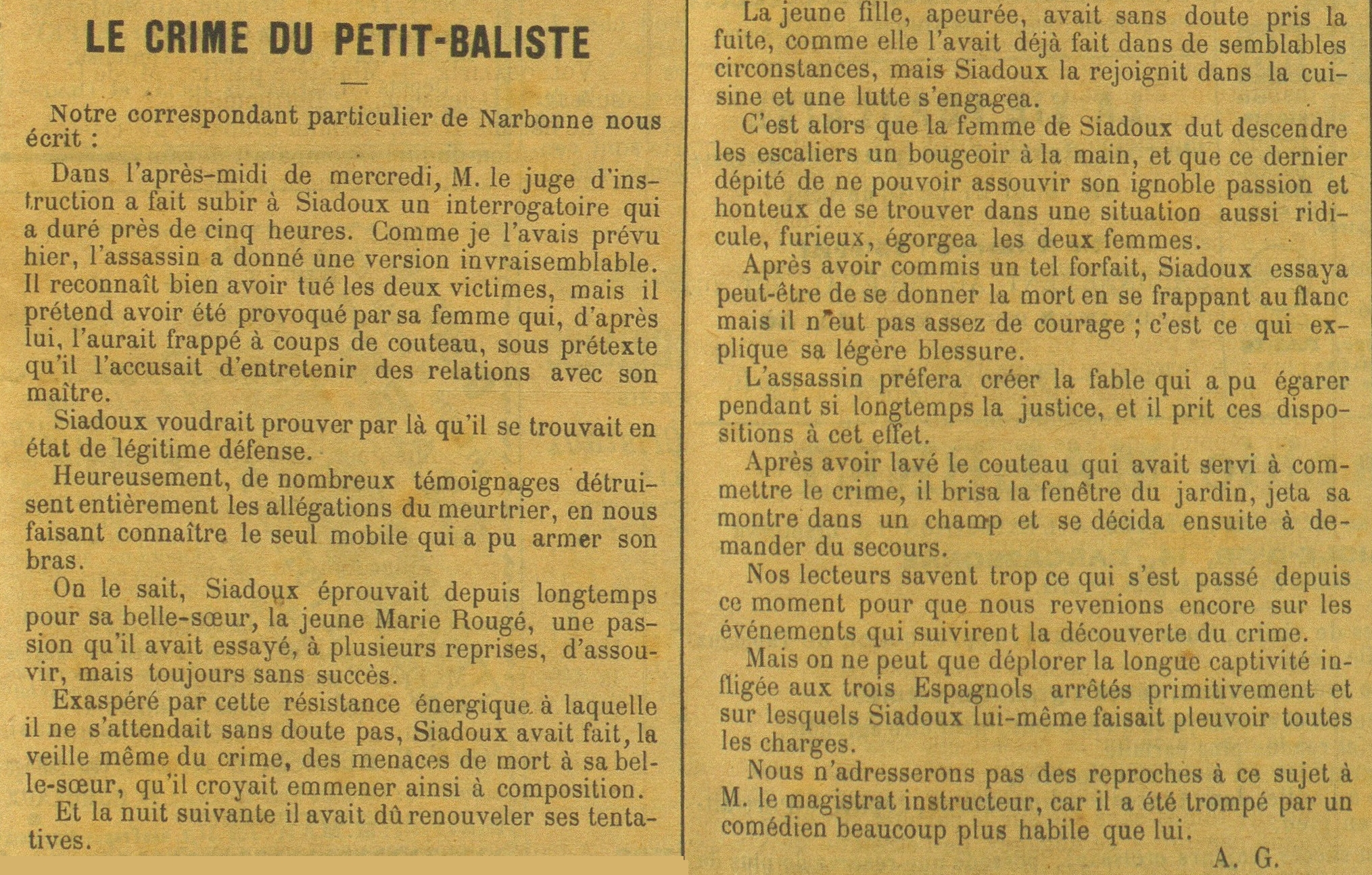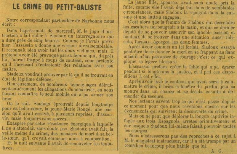 Ils lui reprochent alors son crime, qu'il nie en disant que celui qui l'a commis est un espagnol qui est arrêté et entre les mains du Parquet de Narbonne, mais ils trouvent un témoin, le sieur Dussanty, auquel Siadoux, peu d'instants avant son arrestation, avait fait ses confidences et auquel il avait notamment raconté qu'il avait assassiné sa femme et sa belle-sœur parce que sa femme avait eu des relations avec son maître et qu'à la suite d'une scène conjugale il les avait tué toutes deux.