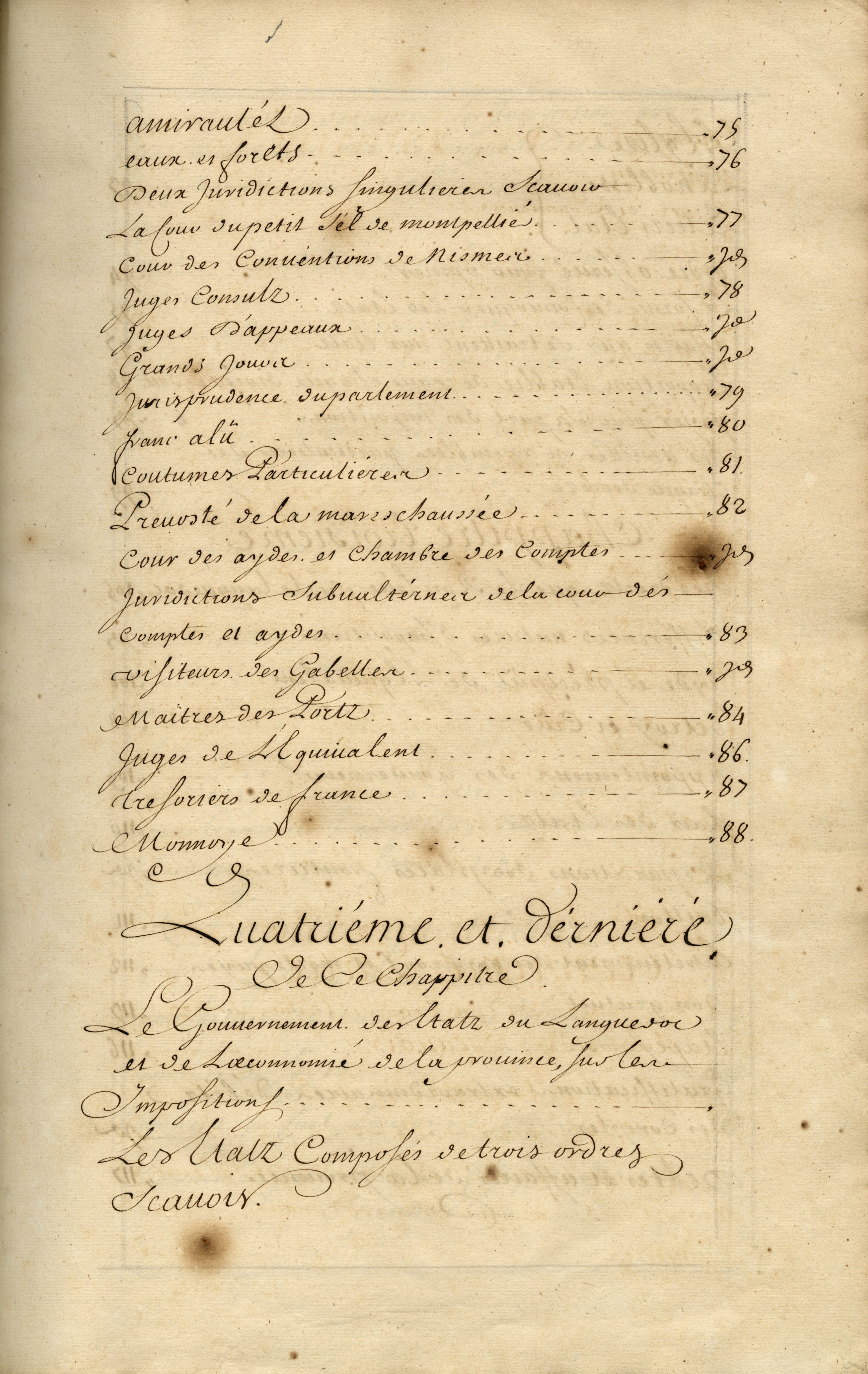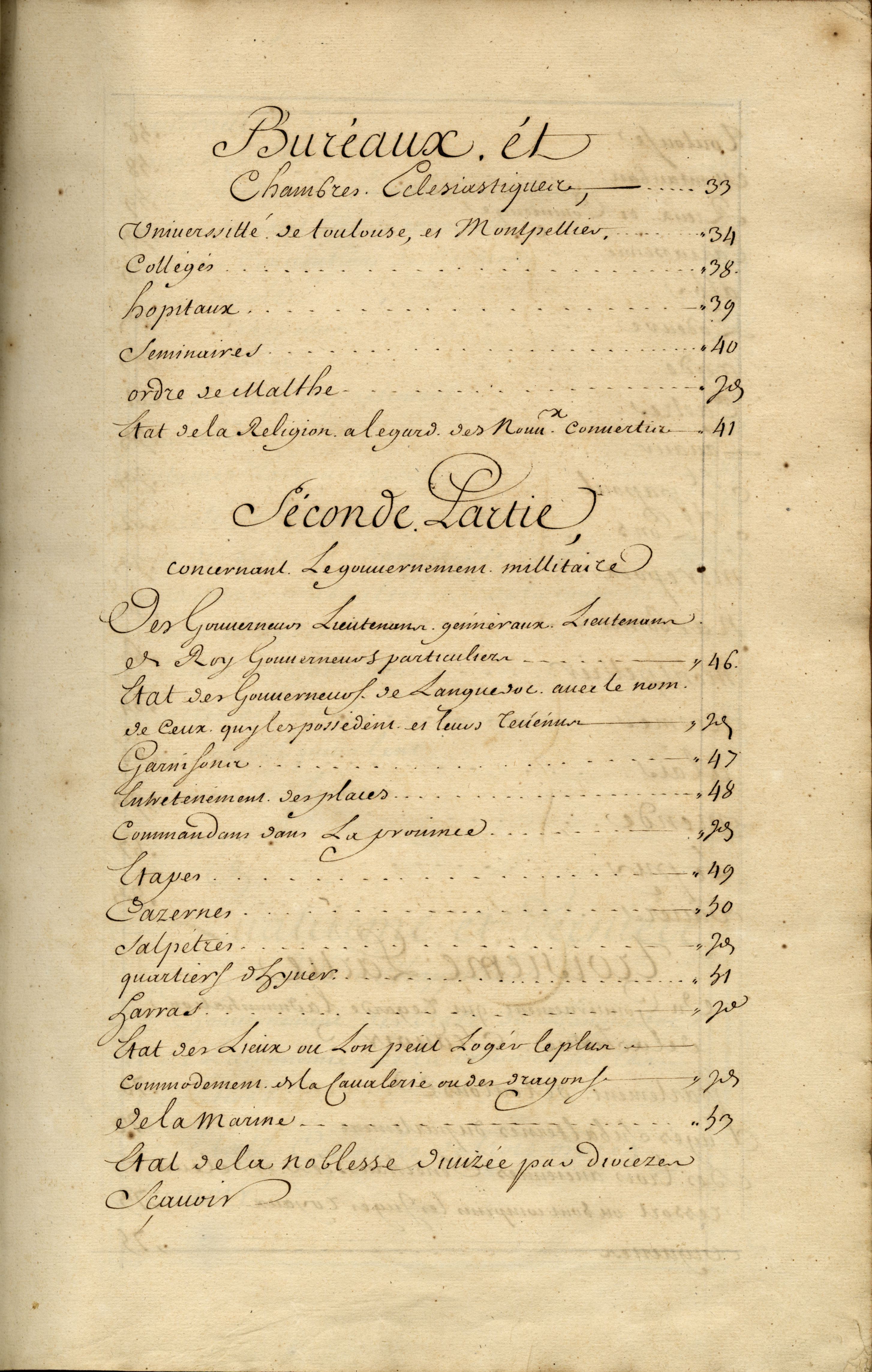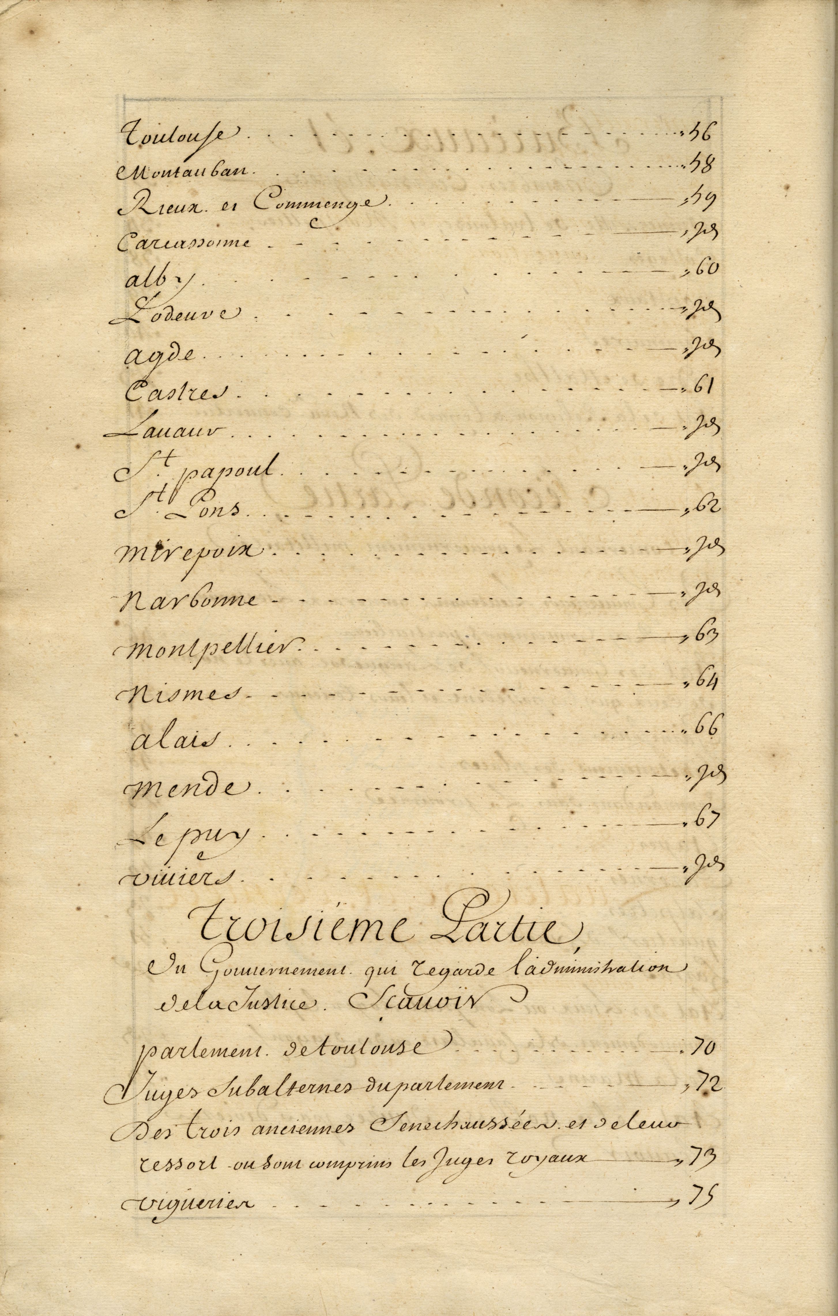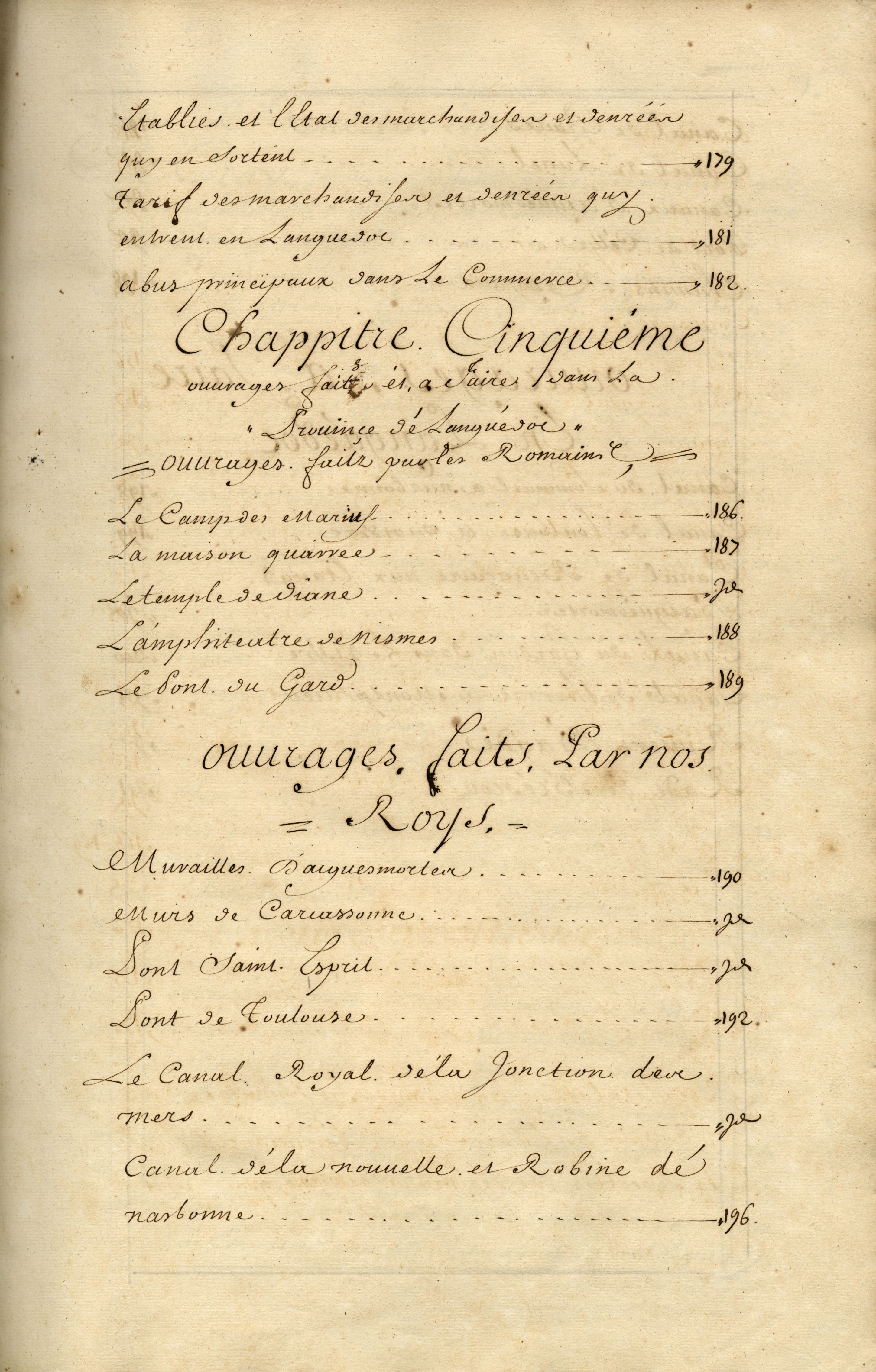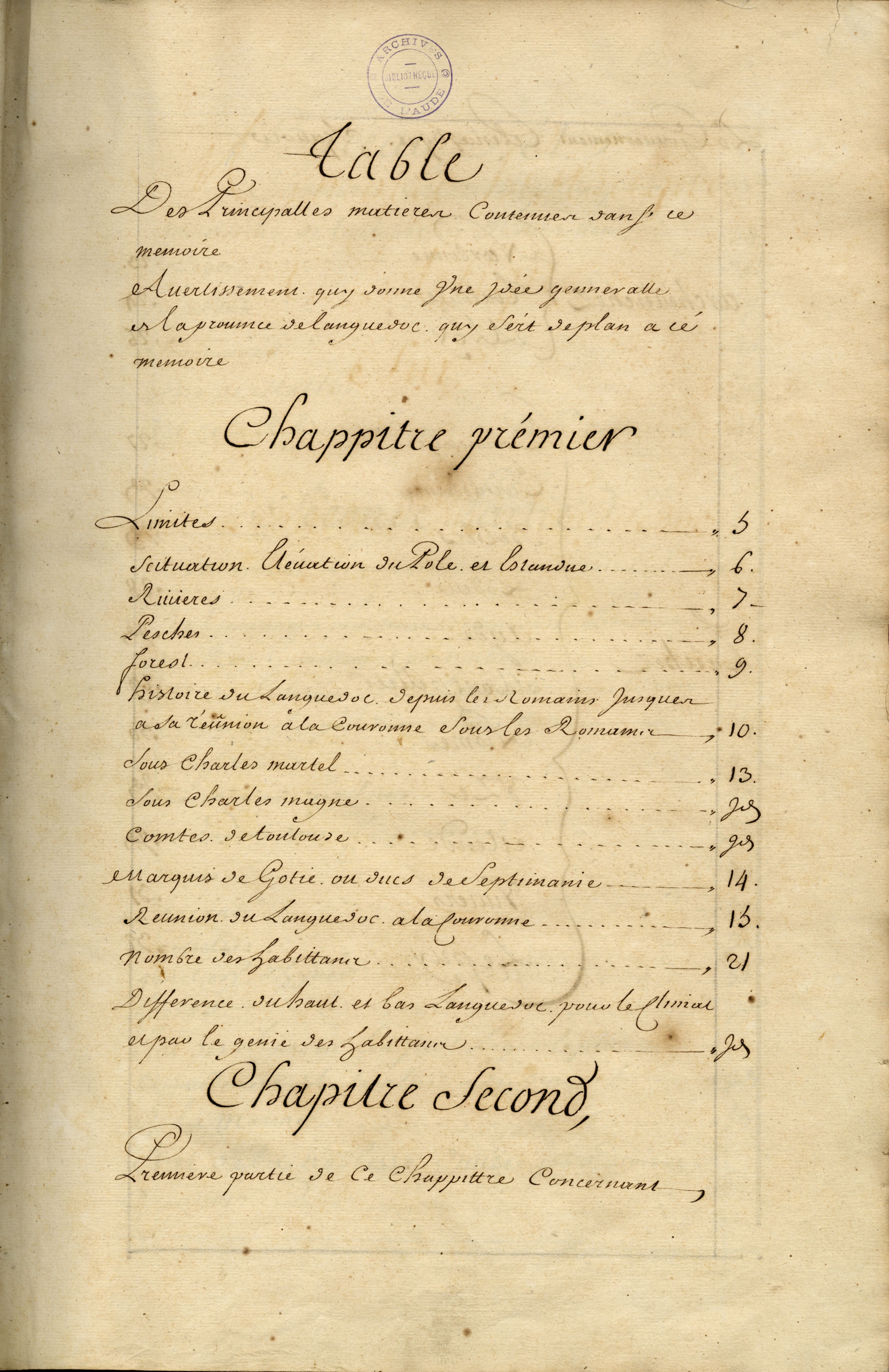 - Mémoires de la province de Languedoc dressé par Monsieur de Lamoignon de Basville, Conseiller d’état ordinaire, intendant du haut et bas Languedoc, en l’année 1698. Extraits de manuscrit en 2 parties, n.p. Cote N° 57/2