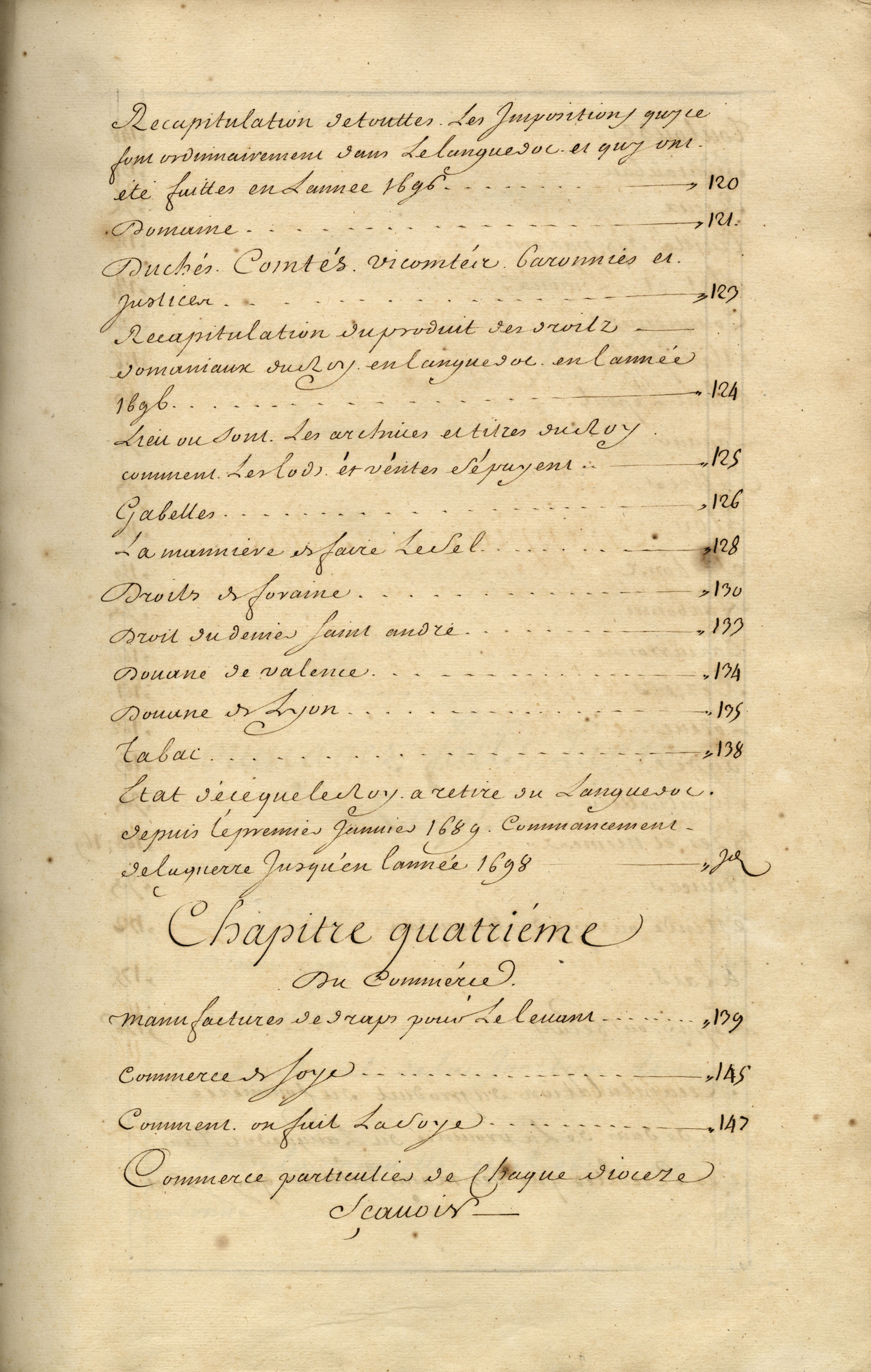 Après avoir décrit la situation des ordres religieux et militaires et porté des considérations sur le fonctionnement des institutions scolaires et universitaires, Nicolas de Basville poursuit son analyse des particularismes locaux. Dans le chapitre consacré au commerce, il reconnaît que « le Canton de Limoux a des vins blancs-qui sont- très bons mais qui ne se transportent pas ». Tandis que « du côté de Castelnaudary, ce sont de très belles plaines, & les terres sont fort bonnes […], il croît dans ce diocèse toutes sortes de denrées, & beaucoup plus de blé qu’il n’en faut pour nourrir le Païs. Les Habitans y vivent de Millet, vendent leur blé, & en payent leurs Charges ».