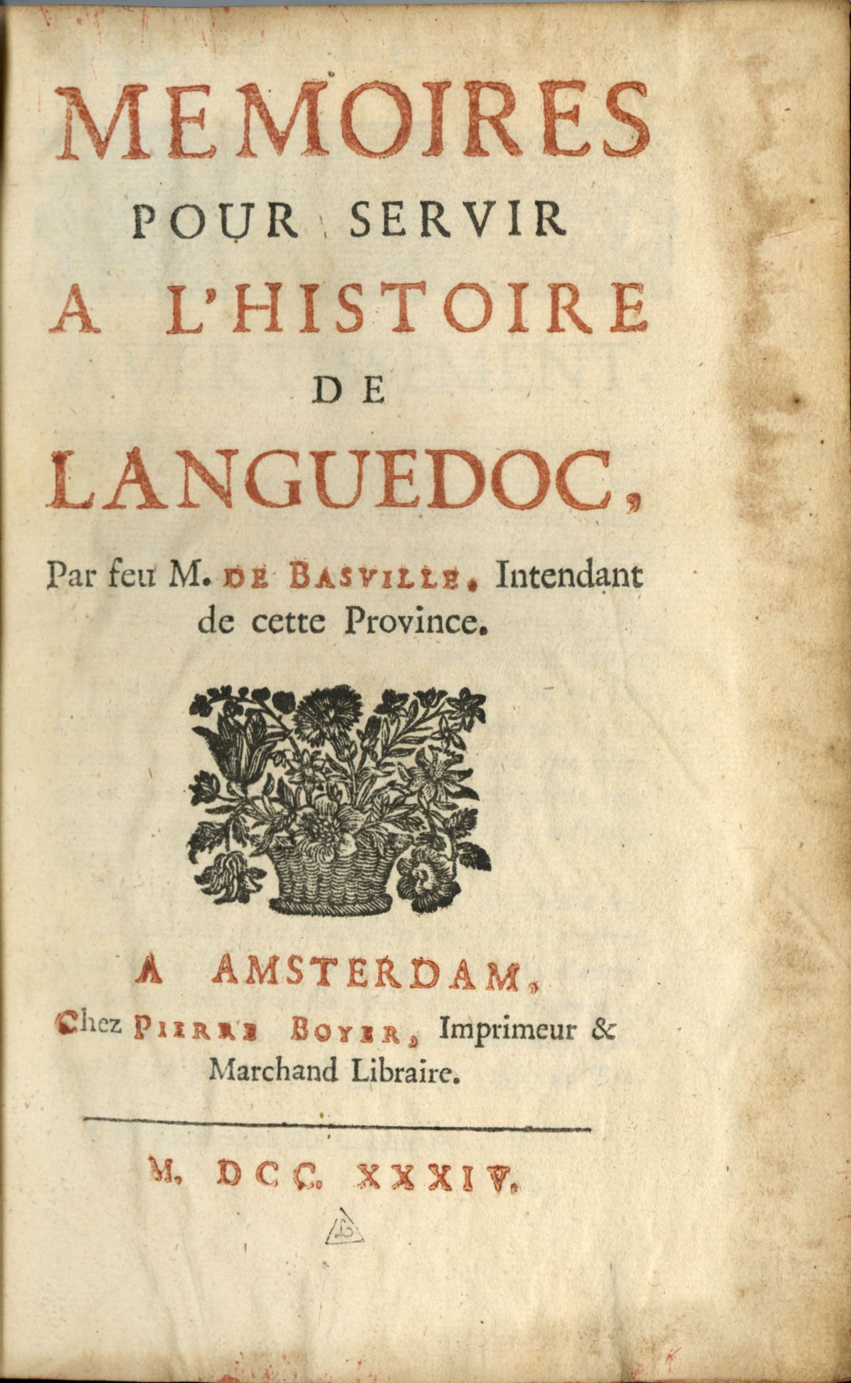 - Mémoires pour servir à l'histoire de Languedoc, par feu M. de Basville, intendant de cette Province / Nicolas de Lamoignon de Basville. – Amsterdam, chez Pierre Boyer, M. DCC. XXXIV. [1734]. - 1 vol. (334 p.- 2 f. de pl.), ill. gr. in-12. Cote CEC 37