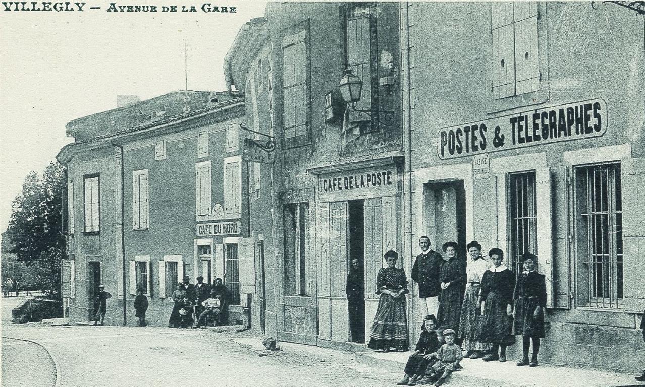 Cette carte postale, représentant l’avenue de la Gare à Villegly, nous plonge à la grande époque des cafés : le café du Nord et son voisin le café de la Poste, tous deux installés à côté du bureau des Postes et Télégraphes.