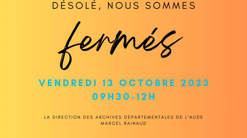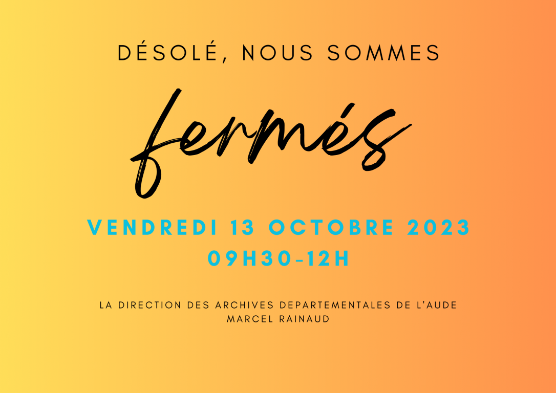 Fermeture exceptionnelle de l'accueil Vendredi 13 octobre 9h30>12h00 © AD11 L'accueil des Archives sera exceptionnellement fermé vendredi 13 octobre 2023 de 9h30 à 12h00. Publié le 12 octobre 2023 Préc. Retour à la liste Suivant