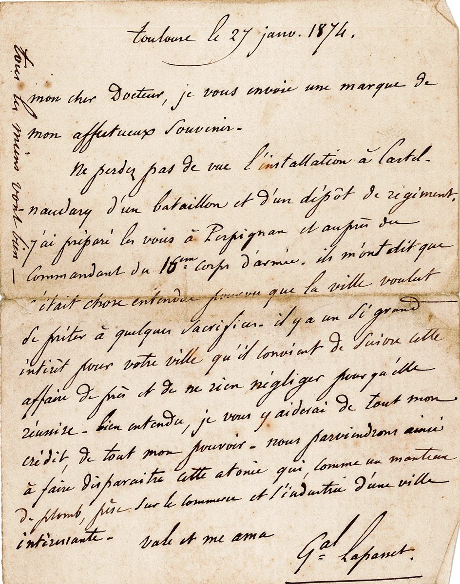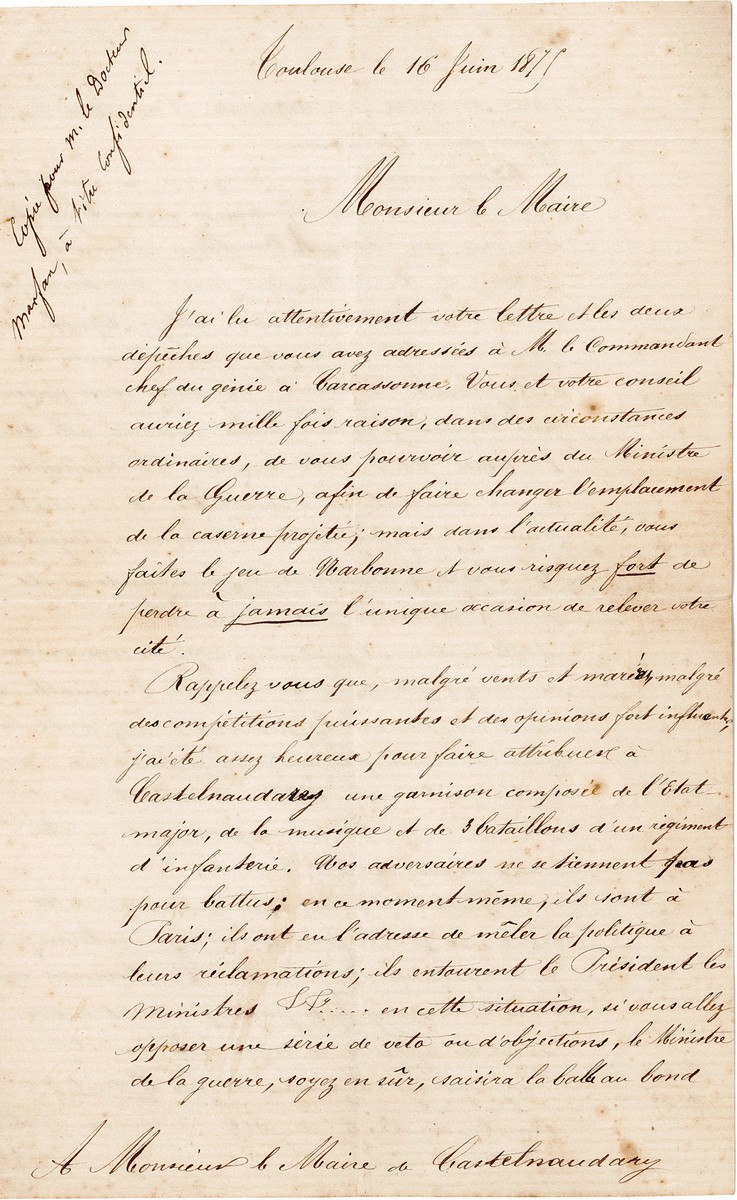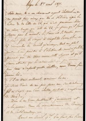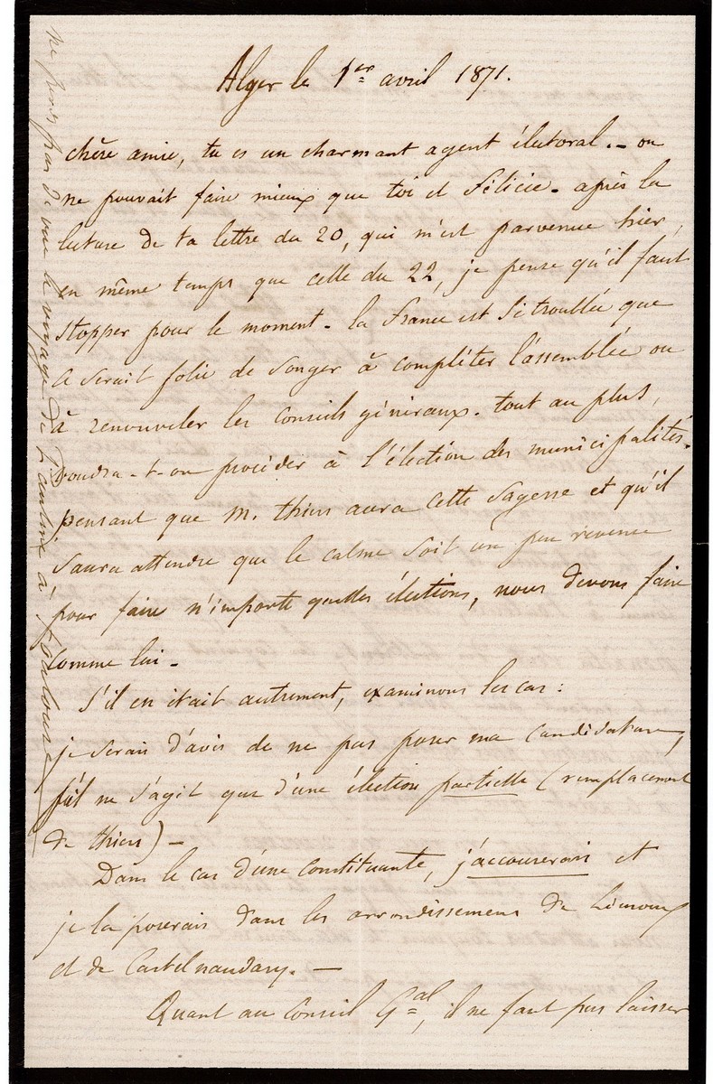 Chère amie, tu es un charmant agent électoral, on ne pouvait faire mieux. Après la lecture de ta lettre du 20 [mars]qui m’est parvenue hier en même temps que celle du 22, je pense qu’il faut stopper pour le moment. La France est si troublée que ce serait folie de songer à compléter l’Assemblée ou à renouveler les conseils généraux, tout au plus voudra t-on procéder à l’élection des municipalités pendant que M. Thiers aura cette sagesse et qu’il saura attendre que le calme soit un peu revenu pour faire n’importe quelles élections, nous devons faire comme lui. S’il en était autrement, examinons les cas. Je serais d’avis de ne pas poser ma candidature s’il ne s’agit que d’une élection partielle. Dans le cas d’une constituante, je la poserais dans les arrondissements de Limoux et de Castelnaudary.[…]