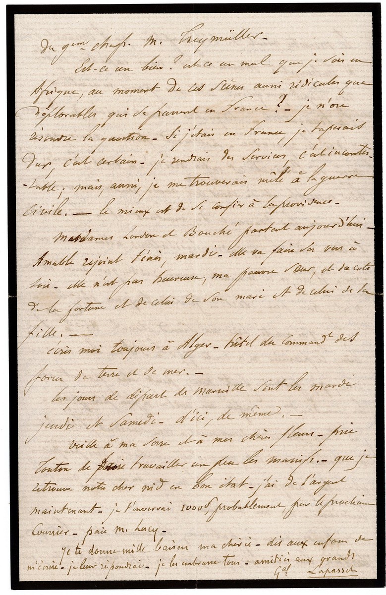 Veille à ma serre et à mes chères fleurs, prie tonton de faire travailler un peu les massifs, que je retrouve notre très cher nid en bon état. […] Je te donne mille baisers ma chérie, dis aux enfants de m’écrire, je leur répondrai. Je les embrasse tous, amitiés aux grands, général Lapasset.