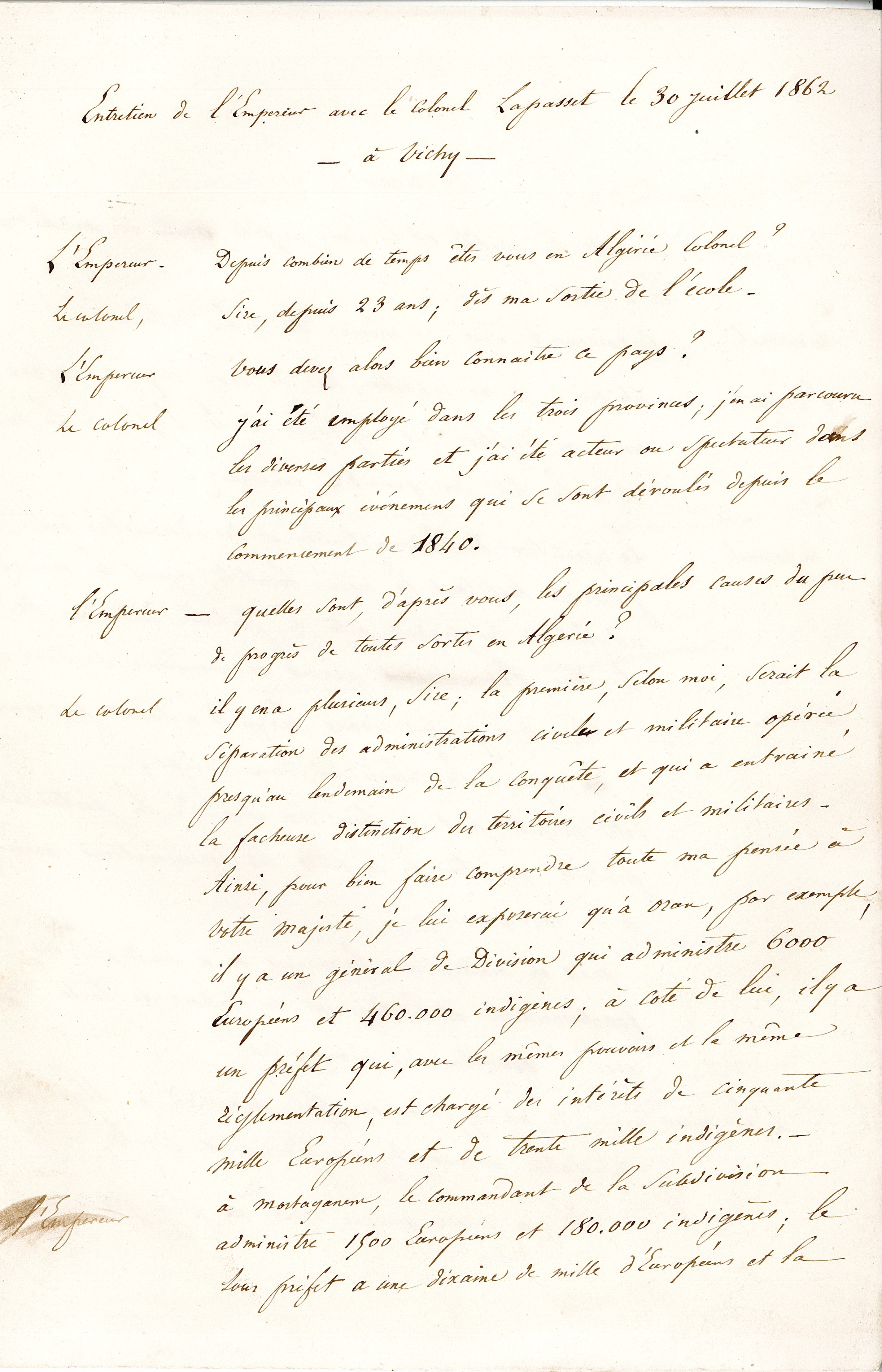 Le Colonel : Il y en a plusieurs, sire ; la première selon moi, serait la séparation des administrations civile et militaire opérée presqu’au lendemain de la conquête, et qui a entrainé la fâcheuse distinction des territoires civils et militaires. Ainsi, pour bien faire comprendre toute ma pensée à votre majesté, je lui exposerai qu’à Oran, par exemple, il y a un général de division qui administre 6000 européens et 460 000 indigènes ; à côté de lui il y a un préfet qui, avec les mêmes pouvoirs et la même règlementation, est chargé des intérêts de cinquante mille européens et de trente mille indigènes. […] En multipliant les rouages on a multiplié les fonctionnaires et les dépenses en dehors de toute proportion avec le nombre des administrés.