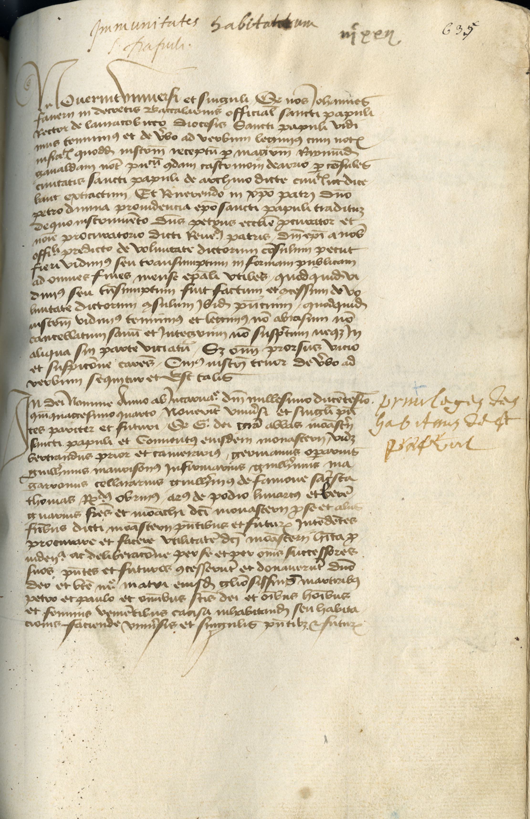 Géraud, abbé du monastère de Saint-Papoul, concède certains privilèges à ceux qui habitent et viendront habiter au lieu de Saint-Marcel, jouxtant ledit monastère. L’acte original de 1255 n’est pas conservé. Nous connaissons ce texte grâce à un vidimus du XVe siècle transcrit dans le Cartulaire de l’évêché de Saint-Papoul (document coté G 233).