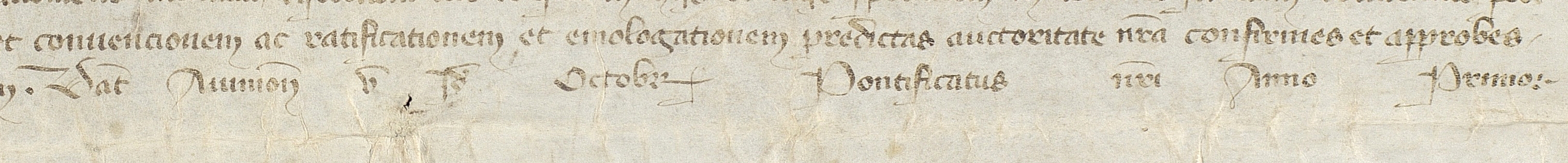 Exemple ci-dessous : « V des ides d’octobre de notre pontificat, première année », soit le 11 octobre (cinquième jour avant les ides) 1394 (le pape est alors Benoît XIII).