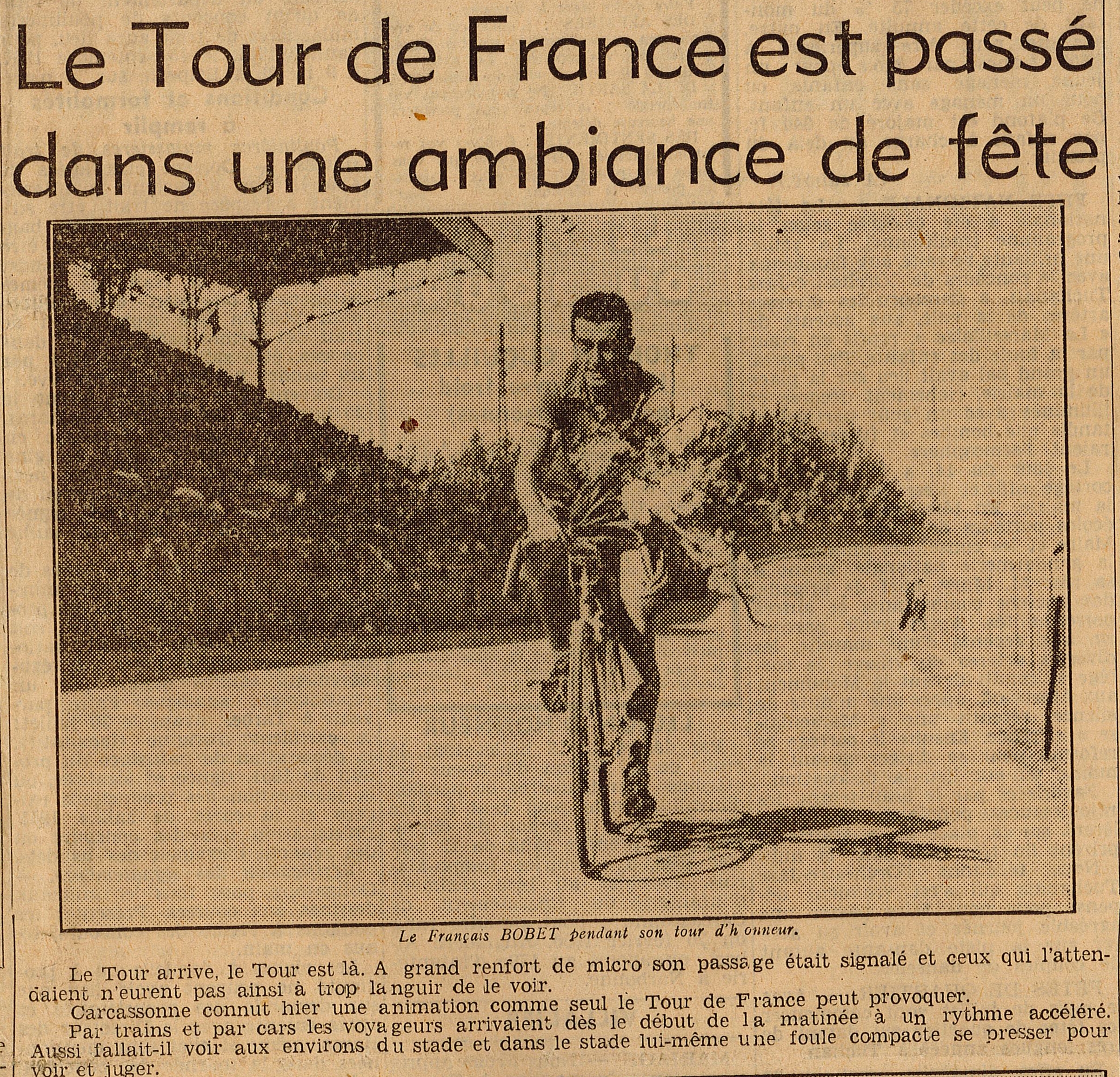 En 1947, c’est la reprise du Tour de France après l’interruption liée à la guerre. Et c’est la première fois qu’il s’arrête à Carcassonne, le 11 juillet, avec l’étape Montpellier-Carcassonne qui se termine au vélodrome de la Pépinière (stade Albert Domec). Le lendemain, les coureurs repartent vers Bagnères-de-Luchon.