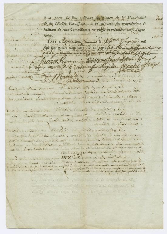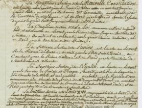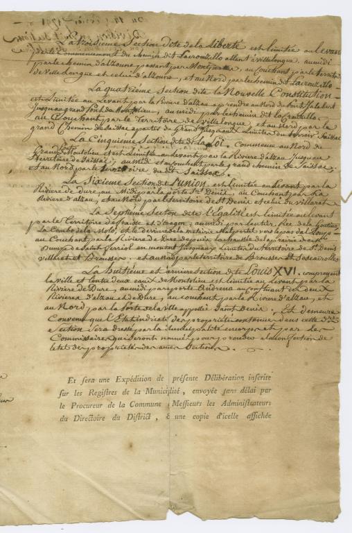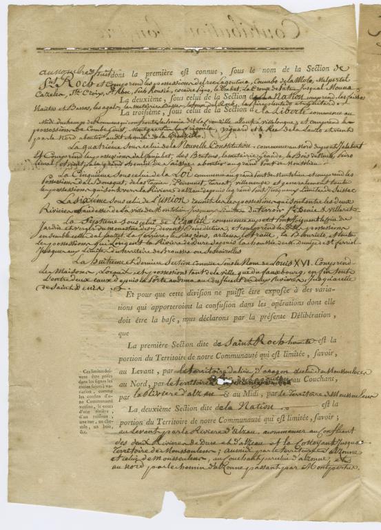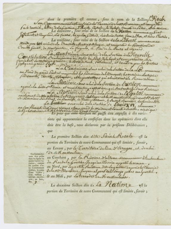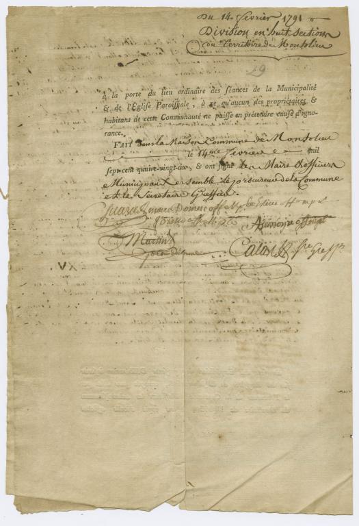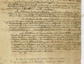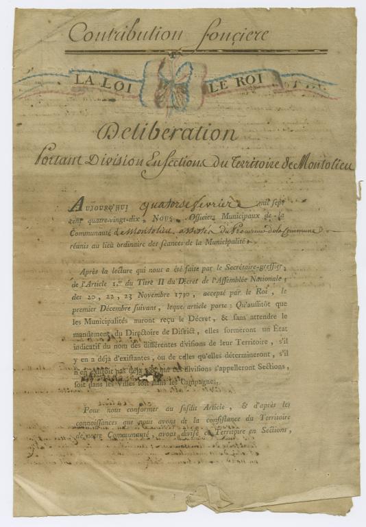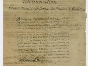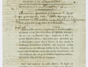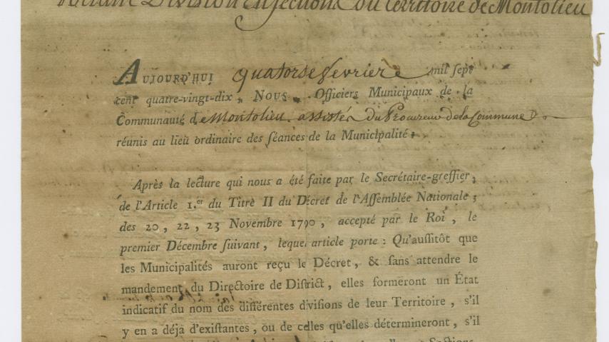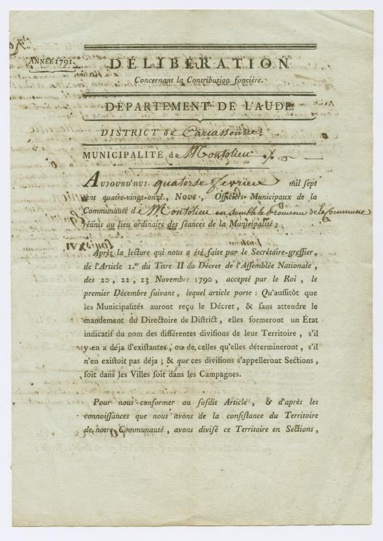 En effet, ce fonds de dix mètres linéaires met bien en lumière les us et coutumes des XVIIIe et XIXe siècles. Par exemple, il autorise une étude de la population du « canton de Montolieu », durant la période révolutionnaire (An III- An VIII). A cette époque, on parle alors de « l’administration municipale de canton ». Cette particularité administrative, tout droit issue de la Révolution, fait l’objet d’un classement à part dans les collections. Ces documents ont donc été retirés du fonds communal (sous-série 4 E) pour être classés dans la sous-série 8 L (Municipalités de cantons). Cette étude peut d’ailleurs se poursuivre plus tard, lorsque Montolieu intègre le canton d’Alzonne dès l’An VIII (1800). Territorialement, la commune est en outre définie en huit sections cadastrales dès 1790, concrétisées par le plan napoléonien en 1811.