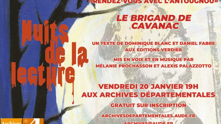 - 19h : Lecture musicale : Rendez-vous avec l’Antougnou, un spectacle créé pour l’occasion par Mélanie Prochasson et Alexis Palazzotto. Montage de textes à partir du livre : Le brigand de Cavanac, le fait divers, le roman, l’histoire / Dominique Blanc & Daniel Fabre © Éditions Verdier, 1982, 2015 et d’extraits de presse du journal hebdomadaire : Le Moniteur de l’Aude.