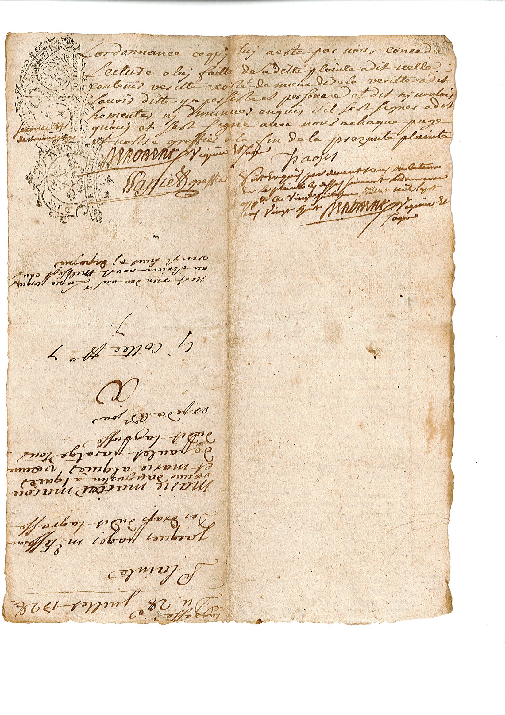 Les dépositions des témoins occupent sept pages du document qui vous est présenté ici. S’en suit, le 3 août, la décision du procureur juridictionnel, qui après avoir lu la plainte et les témoignages, annonce que Marie Macou et sa fille Marie Alquier « doivent estre décrettées d’ajournement personnel pour voyes deffet et injures attroces et verbales par elles commises et proférées contre la personne et l’honneur du dit Jacques Pagès ».