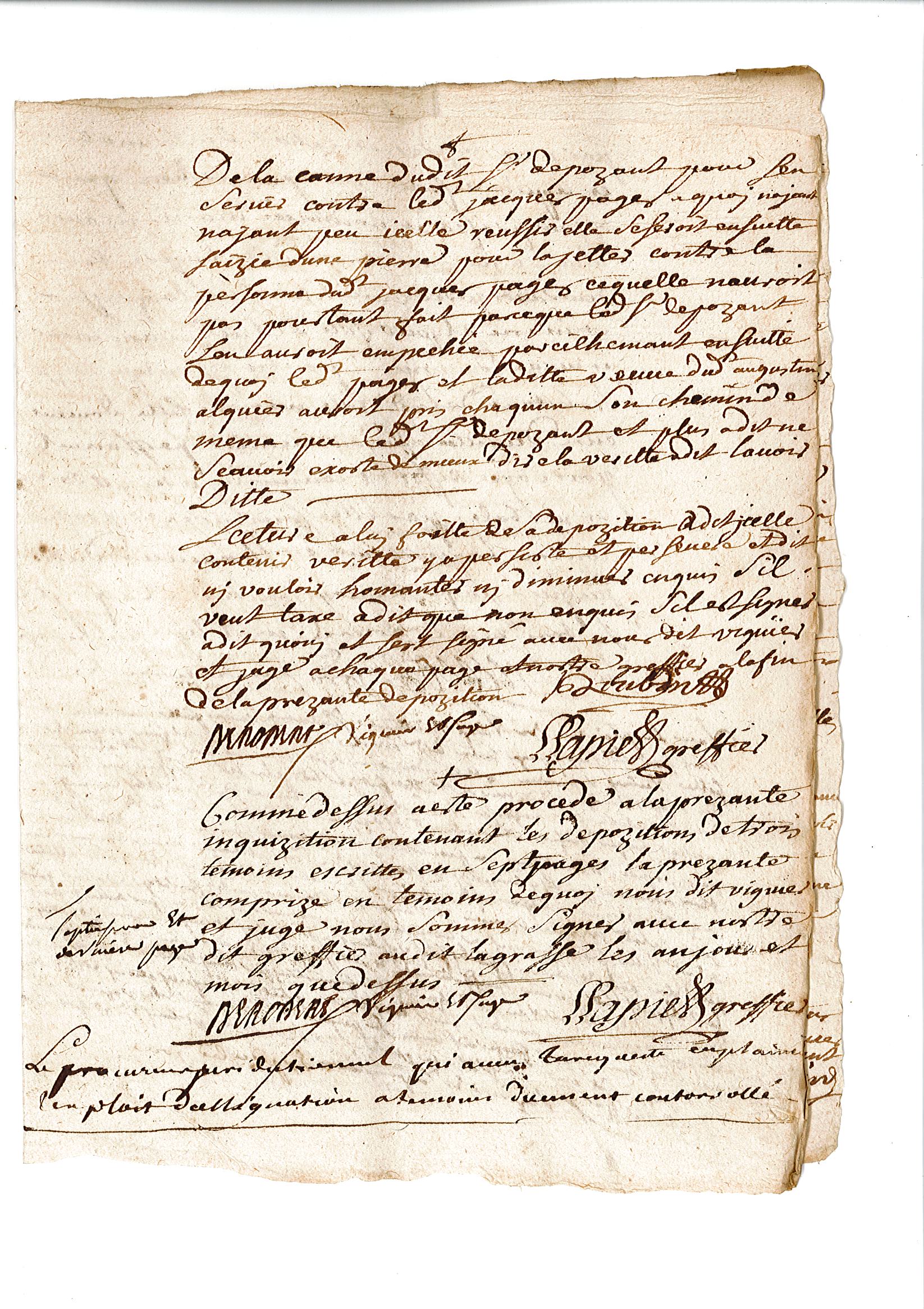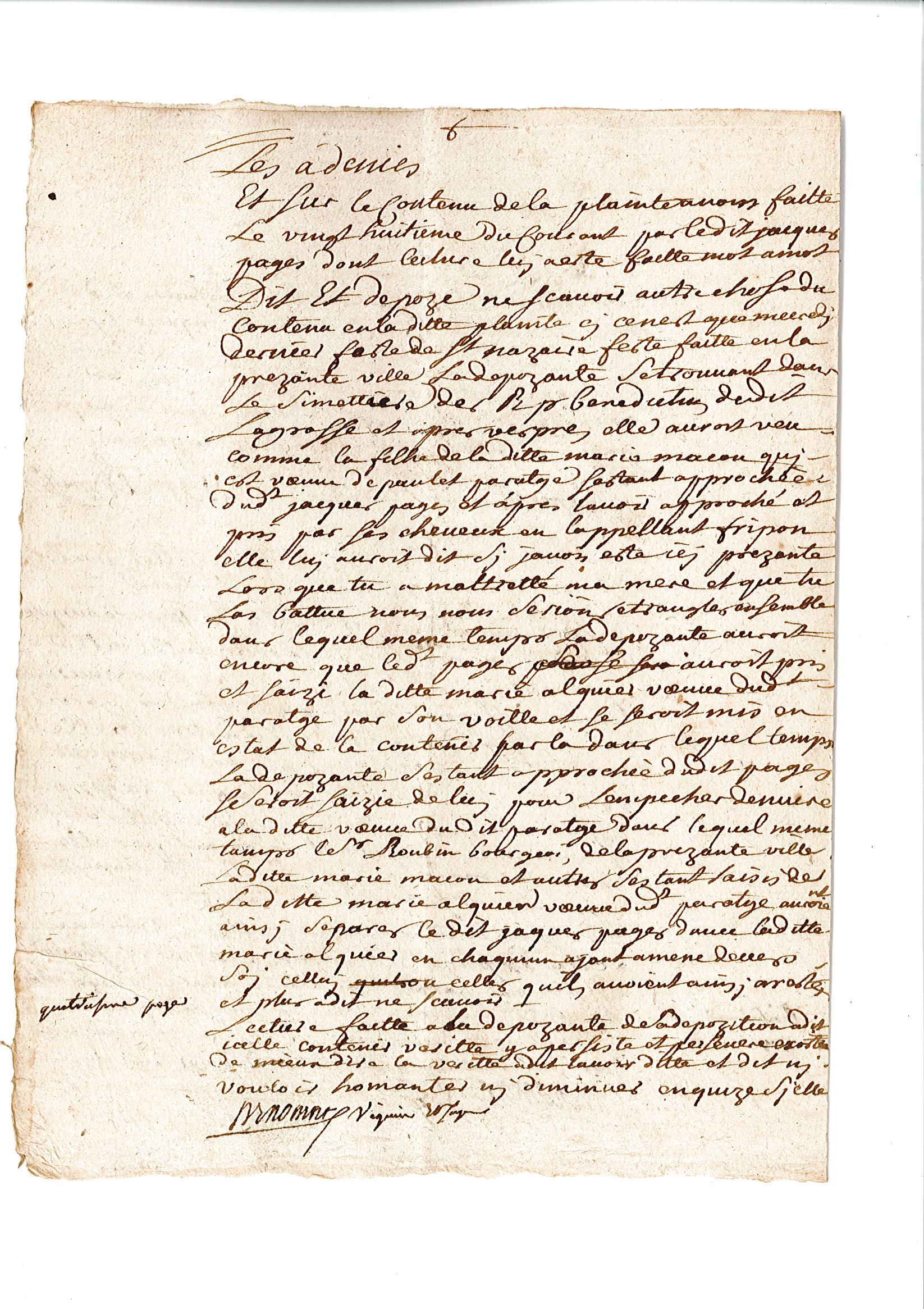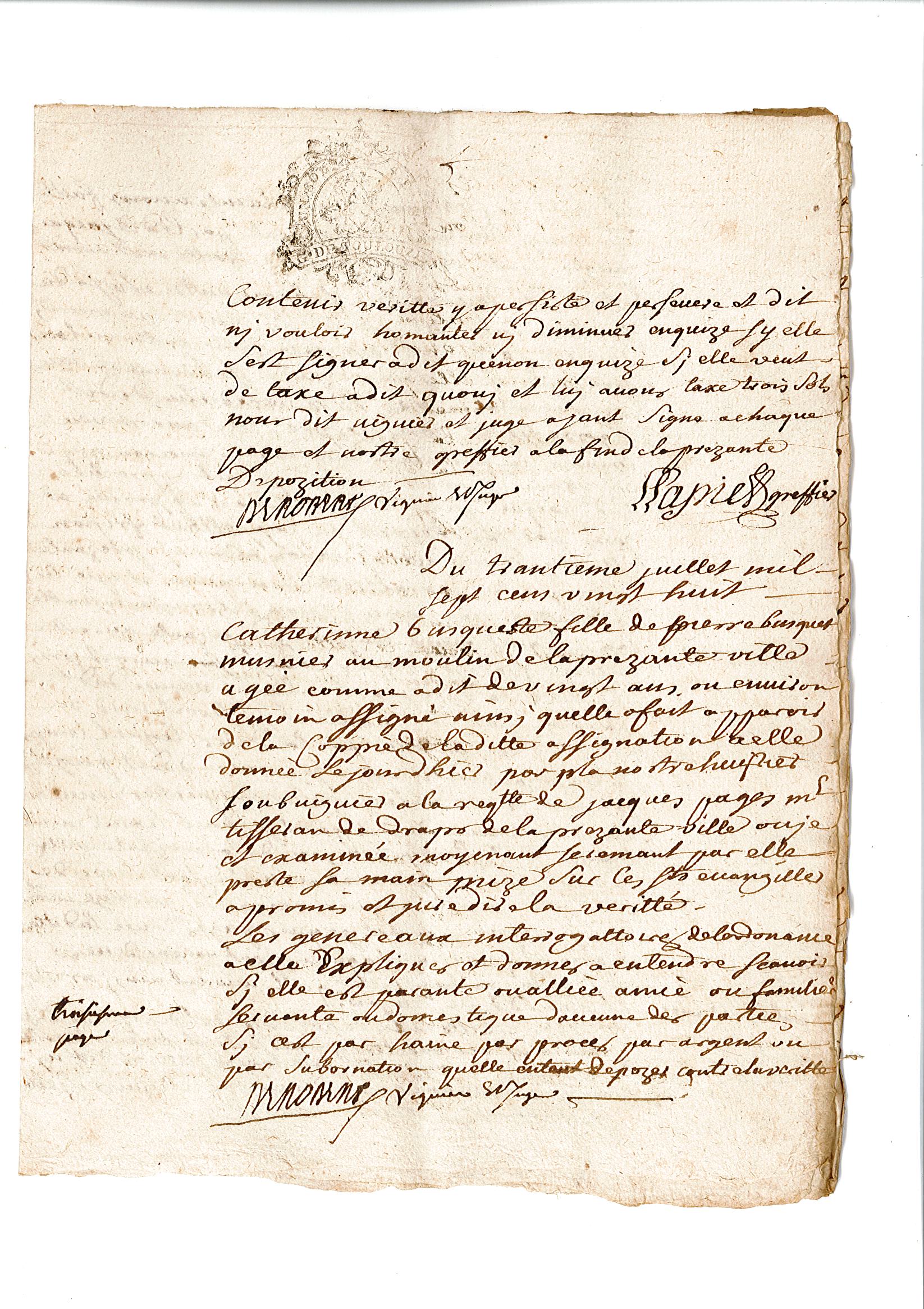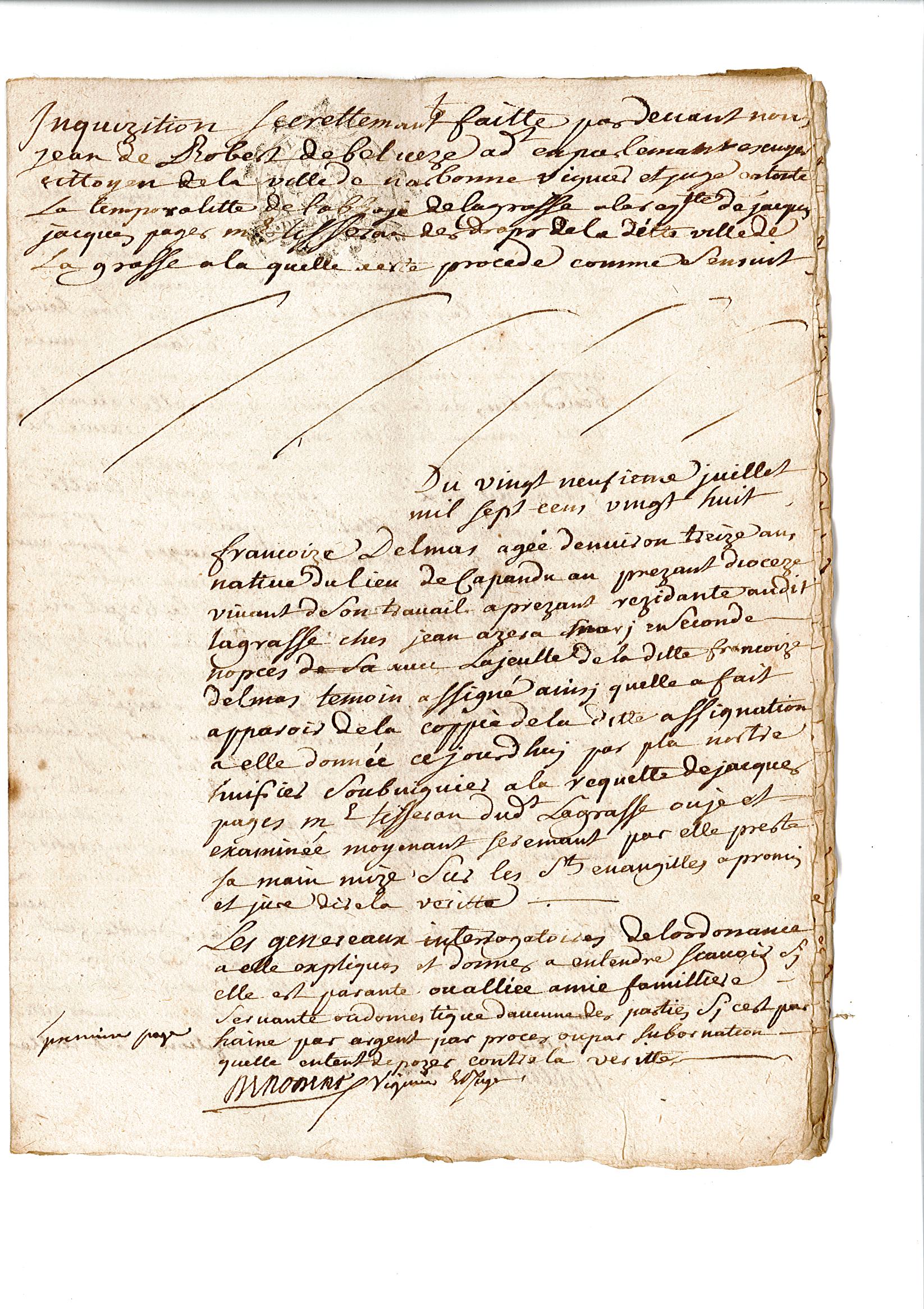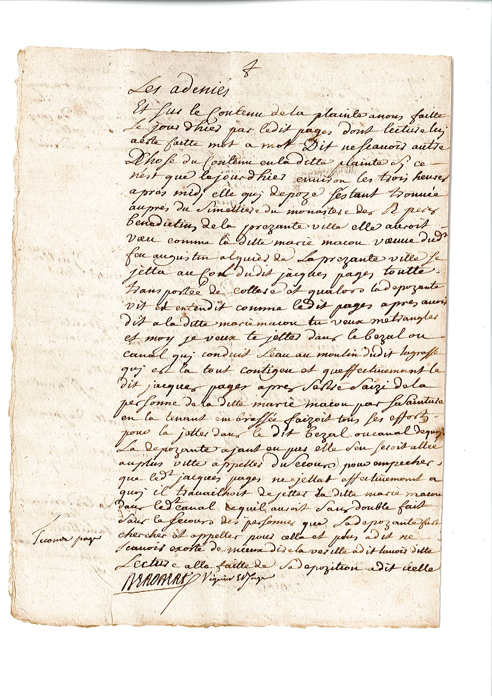 L’enquête se poursuit le lendemain par l’audition des témoins, à commencer par Françoise Delmas, qui prête serment sur les évangiles de dire la vérité. Les témoins ne doivent pas être de la même famille que le plaignant, ni travailler pour lui. Françoise a 13 ans. Elle apporte de nouveaux éléments à l’affaire : « elle auroit veu comme la ditte Marie Macou se jetta au col du dit Jacques Pagès, toutte transportée de collère » mais elle dit aussi que « le dit Pagès, après avoir dit à la ditte Marie Macou « Tu veux m’étrangler et moy je veux te jetter dans le bezal ou canal qui conduit l’eau au moulin du dit Lagrasse, qui est là tout contigeu », et qu’effectivemant le dit Jacques Pagès, après s’estre saizi de la personne de la ditte Marie Macou par sa sainture, en la tenant embrassée, faizoit tous ses efforts pour la jetter dans le dit bezal ou canal, de quoy la dépozante, ayant eu pur, elle s’en seroit allée au plus vite appeler des secours ».