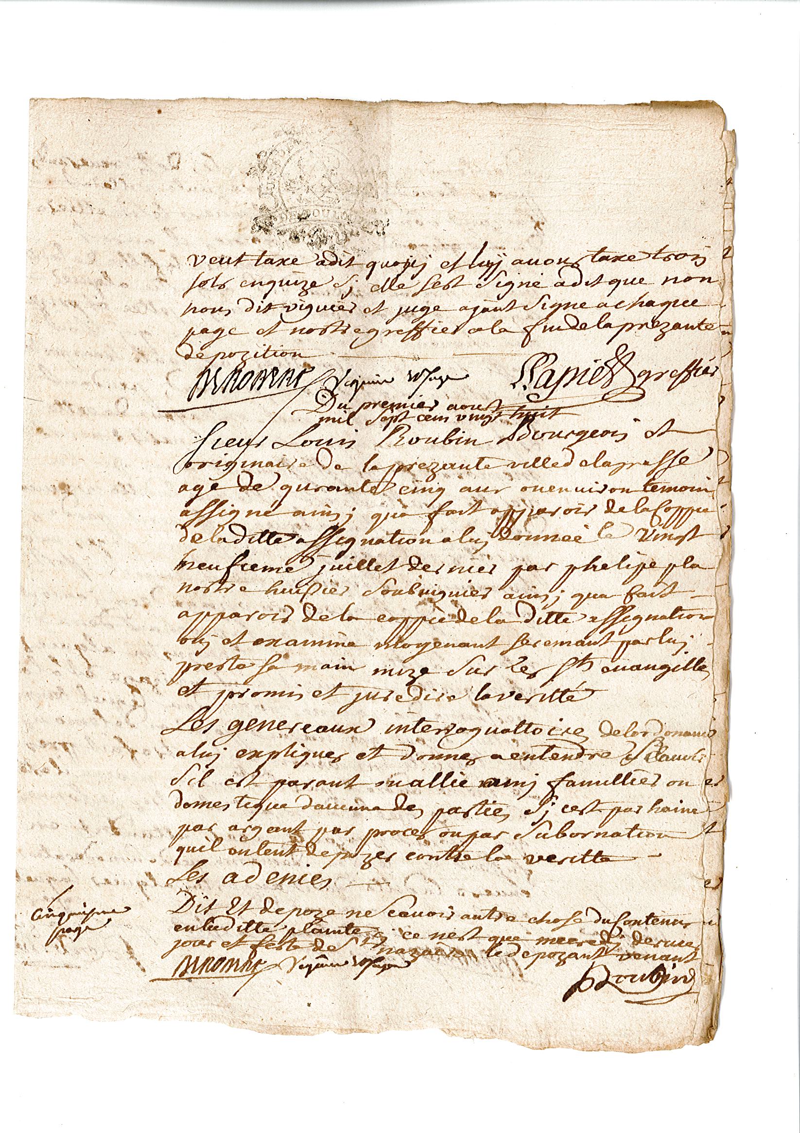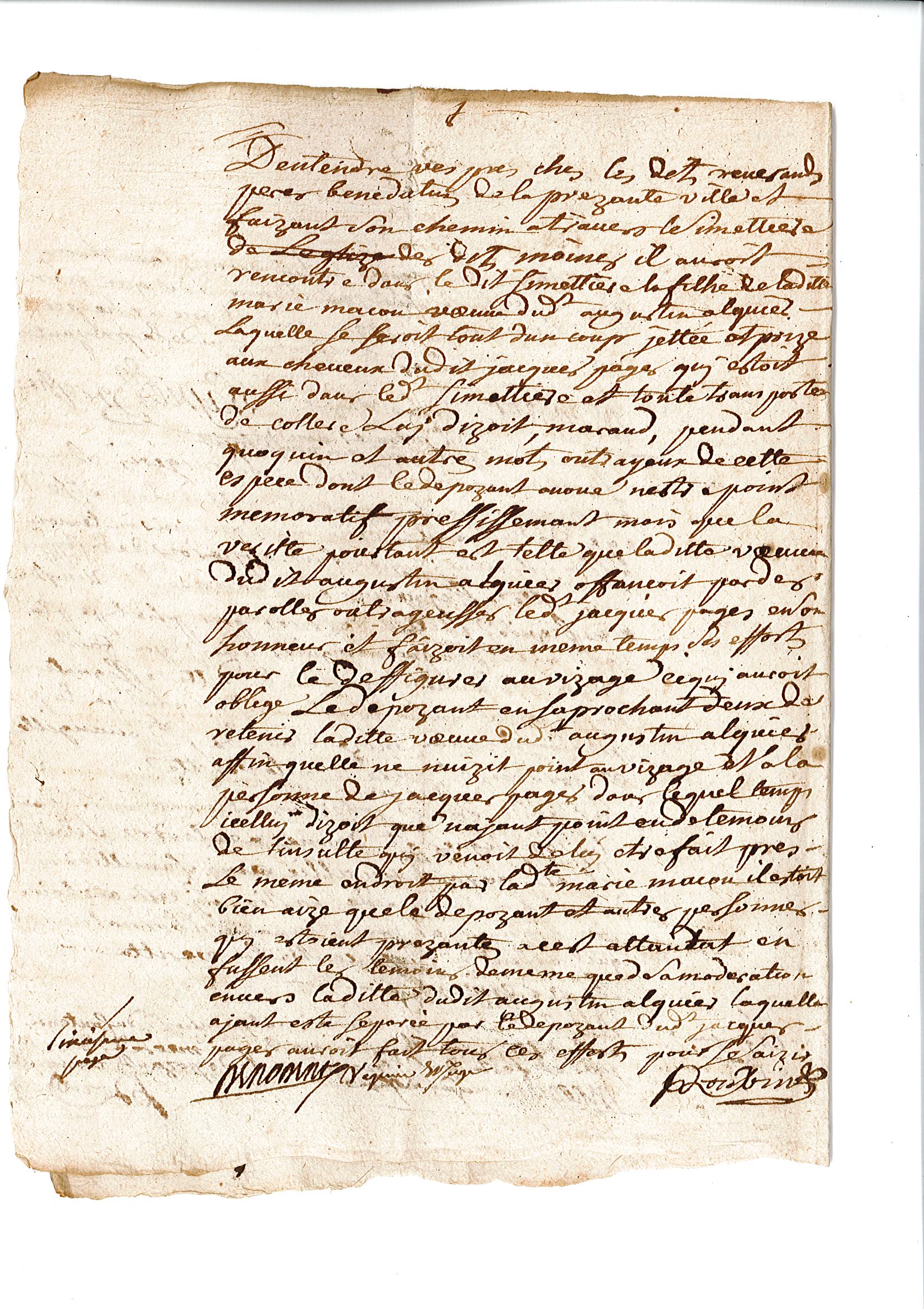 Enfin, le 1er août, le dernier témoin est entendu. Il s’agit de Louis Roubin, bourgeois de Lagrasse, âgé de 45 ans. Il dit avoir « rencontré dans le dit simettière la filhe de la ditte Marie Macou, laquelle se seroit d’un coup jettée et prize aux cheveux du dit Jacques Pagès qui estoit aussi dans le dit simettière et, toute transportée de collère, lui dizoit « maraud, pendart, quoquin » et autres mots outrageux de cette espèce », et « faizoit en même temps ses efforts pour le déffigurer au vizage ». Marie Macou, « ayant esté séparée par le dépozant du dit Jacques Pagès, auroit fait tous ces efforts pour se saizir de la canne du dit sieur dépozant pour s’en servir contre le dit Jacque Pagès, à quoy n’ayant peu icelle réussir, elle se seroit ensuitte saizie d’une pierre pour la jetter contre la personne du dit Jacques Pagès, ce qu’elle n’auroit pas pourtant fait parce que le dit sieur dépozant l’en auroit empêchée pareilhemant. »
