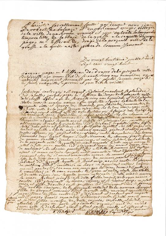 L’enquête commence par le dépôt de plainte de la victime, Jacques Pagès, maître tisserand de draps âgé de 65 ans, contre Marie Macou, habitante elle aussi de Lagrasse, lingère des révérends pères bénédictins du monastère de ladite ville. Il relate ainsi les faits : « ce jour d’huy, sur les trois heures après-midi, le plaigniant allant assister à un baptême qui se faizoit dans l’églize des dits révérants pères bénédictins, il auroit rencontré sur son chemin et près le simettière du dit monastère la ditte Marie Macou, laquelle auroit insulté le dit plaignant par parolles outrageuzes et contre la réputation du dit plaignant, laquelle, après s’estre saizi d’une pière et fait tous ses efforts pour la jetter sur le dit Pagès, elle l’auroit appellé à haute voix « voleur, maraud, pendart » et autres parolles de plus obsennes qui puissent être proférées contre la réputation d’un homme d’honneur ». Grave affaire que de bafouer l’honneur d’un homme ! D’autres personnes viennent alors empêcher Marie Macou de jeter une pierre sur le plaignant qui continua son chemin et alla assister au baptême. Revenant chez lui, il rencontre cette fois Marie Alquier, fille de la dite Marie Macou, laquelle aurait crié « volleur, coquin, maraud, pendart. Et-ce avec ma mère que tu viens d’avoir disputte ? Je te veux tuer. Je te veux arracher les yeux ». Jacques Pagès termine ainsi sa plainte.