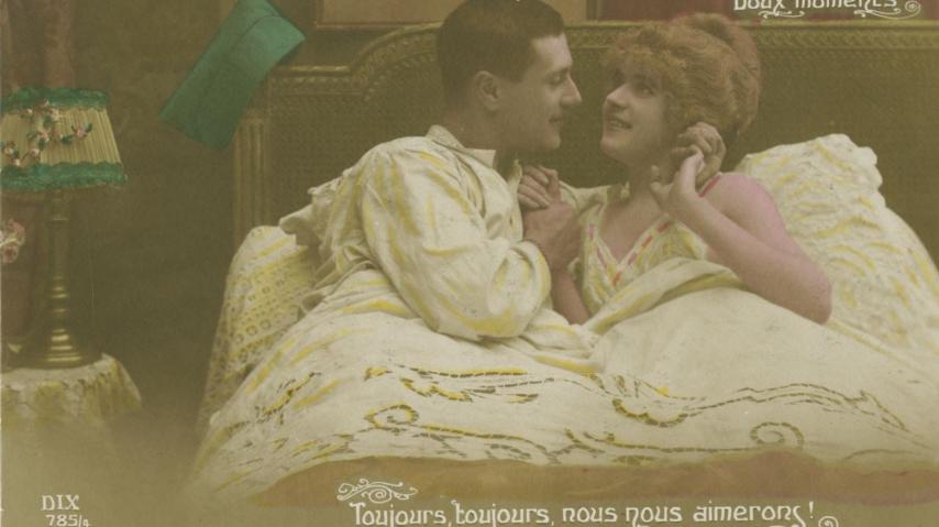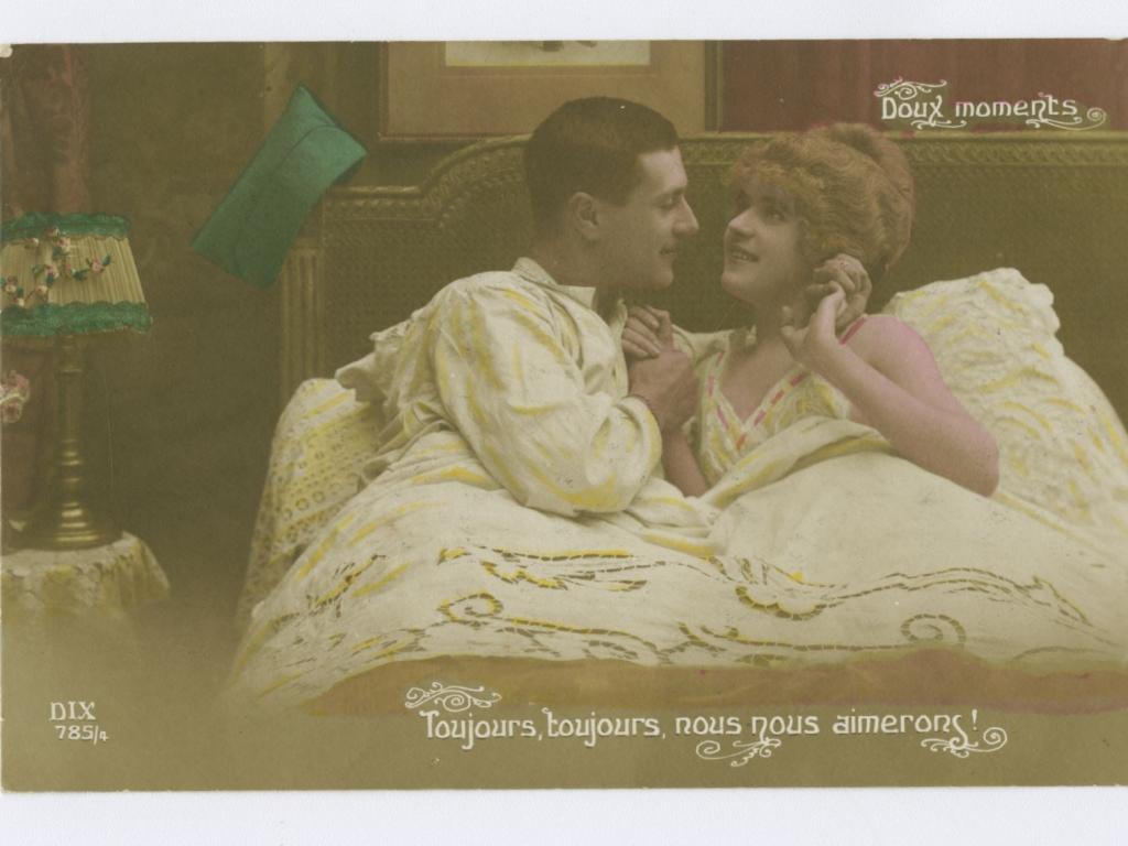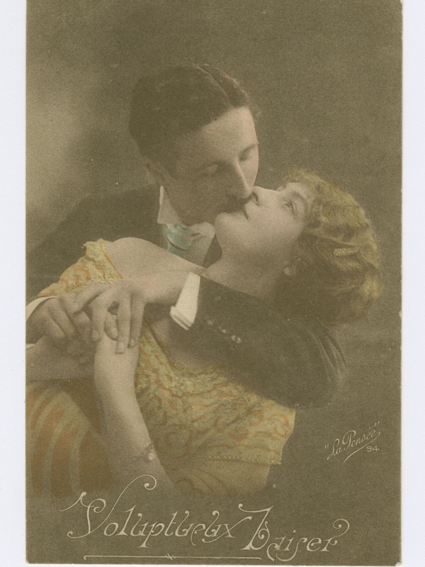 Bien sûr, il n'y a pas que des scènes avec un poilu et sa fiancée, mais également de nombreuses mises en scène imaginatives, reprenant les critères incontournables du romantisme : des fleurs, des poses langoureuses, des baisers, des sourires, des expressions de timidité... Et les maximes qui légendent les cartes renforcent ce sentiment, ainsi que les douces couleurs pastel ajoutées aux clichés sépias. Mais les cartes collectionnées par Antonia Louis renferment un secret. Elles sont collées et ne peuvent pas être manipulées : nous ne saurons donc jamais si leurs versos sont vierges ou s'ils contiennent les plus tendres mots d'un amoureux éperdu !