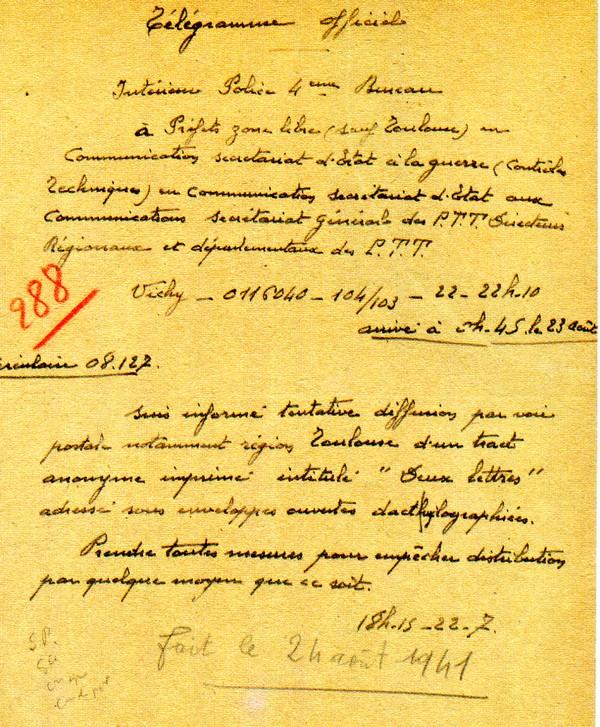 « Suis informé tentative diffusion par voie postale notamment région Toulouse d’un tract anonyme imprimé intitulé "Deux lettres" adressé sous enveloppes ouvertes dacthilographiées [sic ; quelqu’un a barré le h et remplacé le i par un y]. Prendre toutes mesures pour empêcher distribution par quelque moyen que ce soit. »