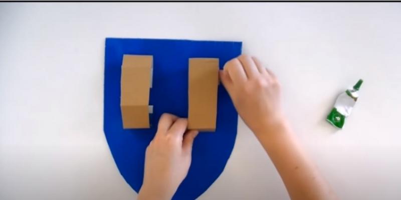 - Retourne ton écu. Mets de la colle sur les extrémités pliées de chacune des 2 bandes.